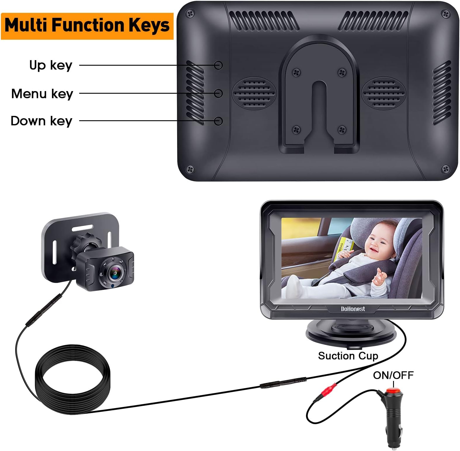 מצלמת תינוק לרכב DoHonest HD 1080P - צג תינוק לרכב הפונה לאחור עם ראיית לילה, זווית ראייה מתכווננת, התקנה קלה, תצוגה נגד סנוור, בטיחות לילדים ותינוקות