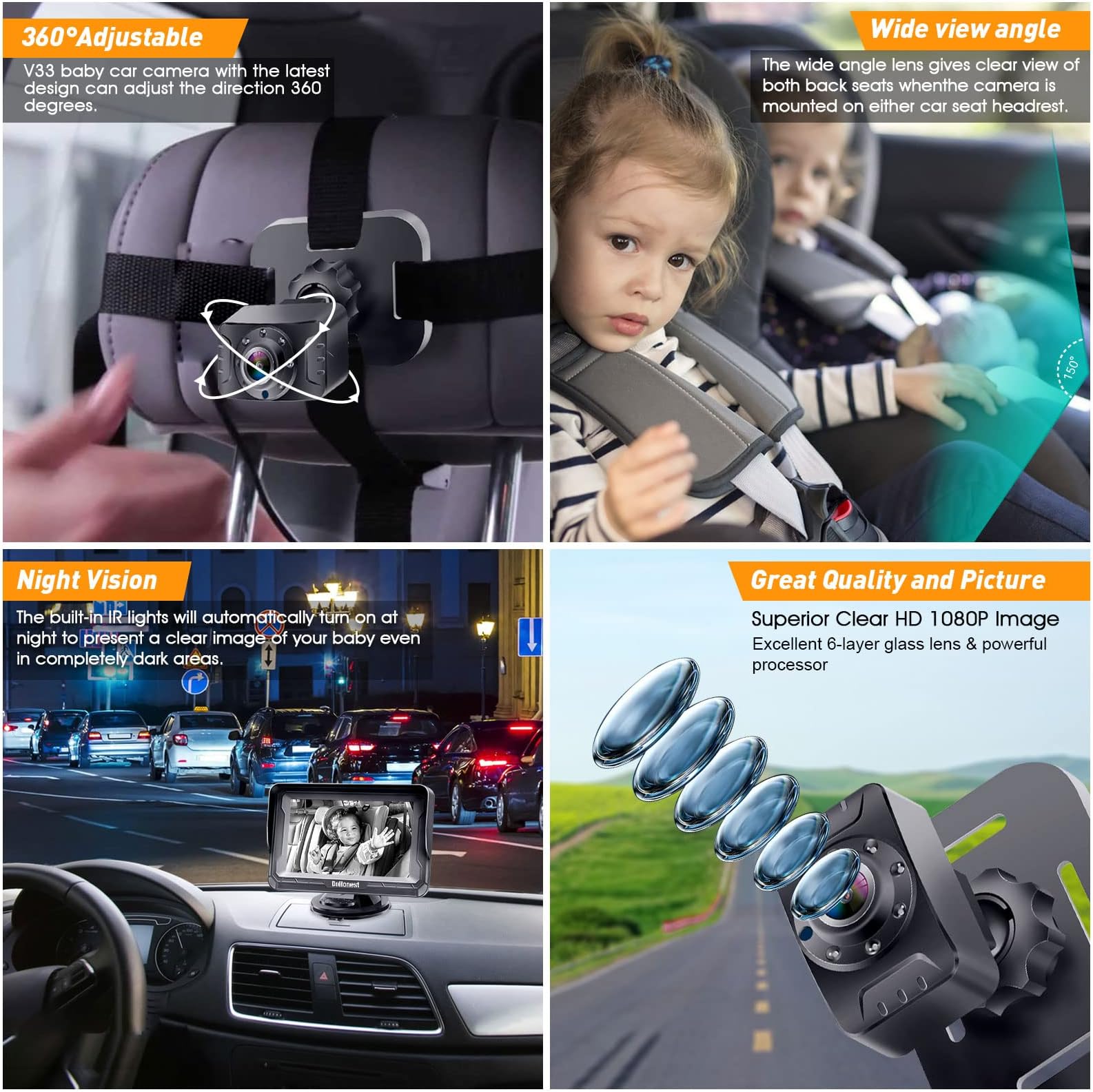 - שקט נפשי מיידי להורים ותינוקות: שמרו על תינוקכם בזמן אמת עם מצלמת הרכב של DoHonest לתינוק. תיהנו מבהירות HD 1080P וזווית תצוגה רחבה של 150°, המבטיחה ראות ברורה ביום ובלילה. ראיית לילה והחלפה אוטומטית מספקים בטיחות מתמשכת לנהיגה ללא דאגות.