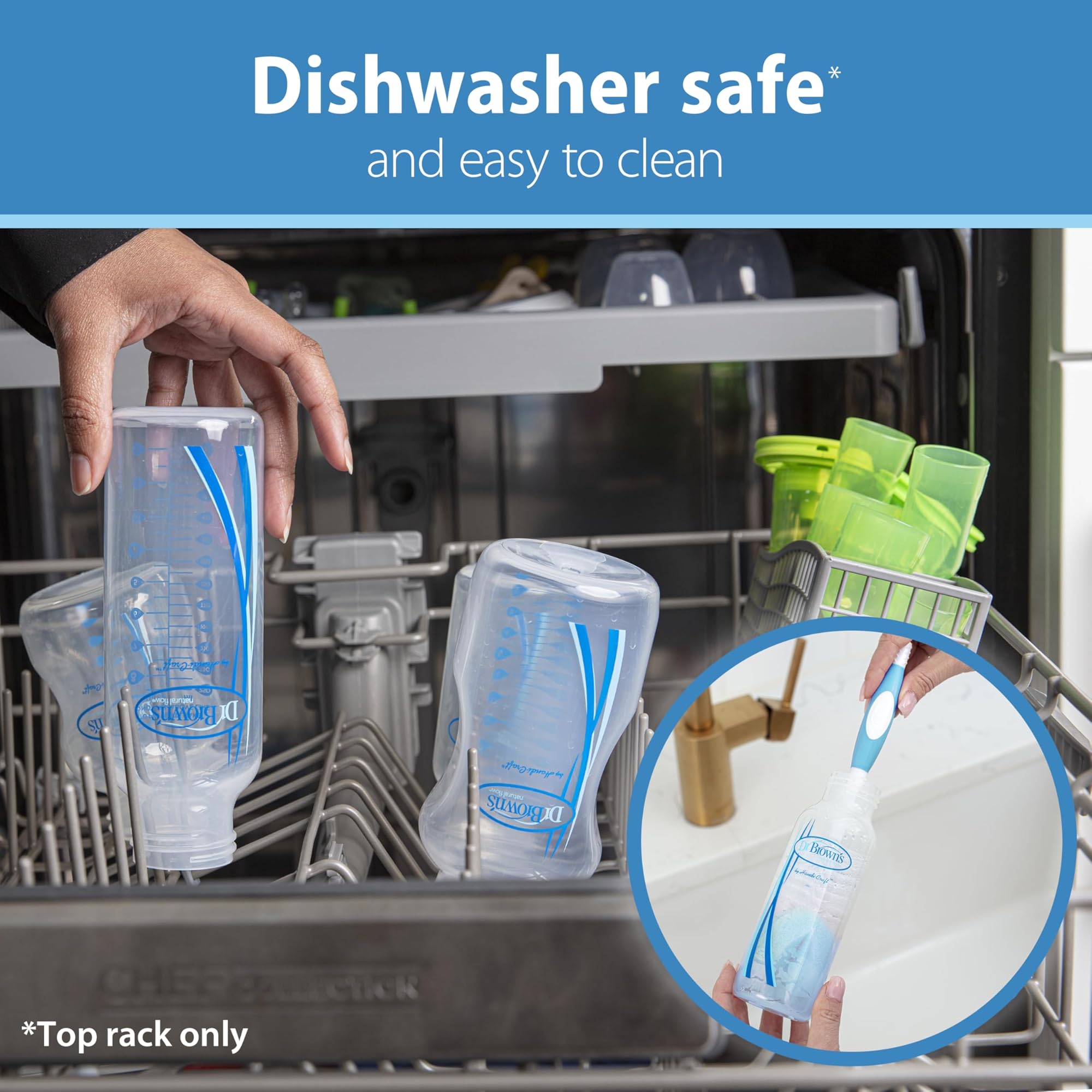 האפשרויות שלך מעולם לא היו טובות יותר עם בקבוק התינוקות הצר Natural Flow® Anti-Colic Options+™ של Dr. Brown's. מערכת האוורור הפנימית נגד כאבי בטן הוכחה קלינית כמפחיתה כאבי בטן. בקבוקי Dr. Brown's® מספקים חווית האכלה נוחה יותר לתינוק על ידי הפחתת יריקה, גיהוק וגזים. האכלה ללא ואקום זו היא הקרובה ביותר להנקה ופטמות הסיליקון של Dr. Brown's® מספקות זרימה עקבית כך שהתינוק יכול לינוק בקצב שלו. צורת הפטמה דמוית השד מעודדת אחיזה נכונה לחוויית האכלה טבעית יותר מבקבוק ומקלה על המעבר מהנקה לבקבוק וחזרה. מערכת האוורור של Dr. Brown's הוכחה כמסייעת בשימור חומרי הזנה מחלב מבקבוק ומסייעת בעיכול לשינה טובה יותר בלילה. פטמת הסיליקון, יחד עם מערכת האוורור הפנימית, מציעים חווית האכלה מבקבוק אמינה ואמינה שהופכת את Dr. Brown's לבקבוק התינוקות המומלץ מספר 1 על ידי רופאי ילדים בארה"ב* הבקבוק שלנו, המיוצר לגדול עם התינוק, נועד להזין אותו בכל שלבי האכלה של התינוק וניתן למחזור. בטוח לשימוש במדיח כלים (במדף העליון בלבד), בסטריליזטורים חשמליים ומיקרוגל או במים רותחים. ללא BPA.