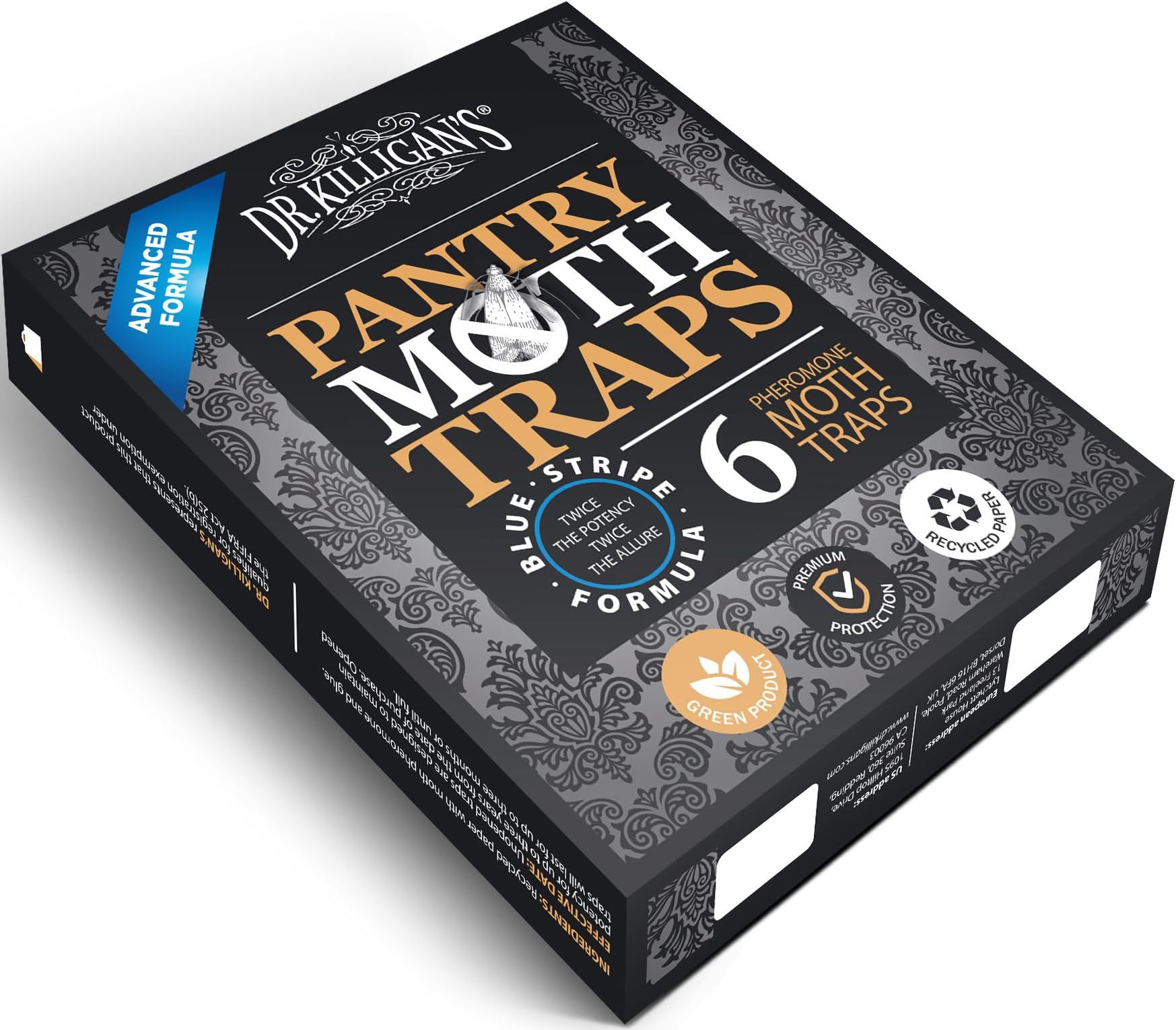 - אפשרויות עיצוב - מלכודות העש של ד"ר קיליגן מעוצבות גם הן בצורה מרשימה, כך שתוכלו להציג אותן בביטחון. בחרו בין שתי אפשרויות עיצוב ייחודיות בעת רכישת חבילה של 6 מלכודות עש פרימיום למזווה. שתי האפשרויות כוללות את אותם פרומונים קנייניים בעלי עוצמה כפולה ואת הדבק ברמה תעשייתית.