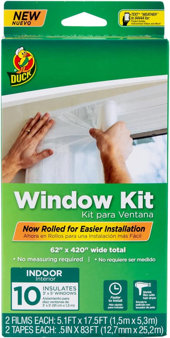 ערכת בידוד חלונות של Duck Brand - ערכת איטום חורף מתאימה לעד 10 חלונות - ניילון מתכווץ מגולגל חותך לגודל להתקנה קלה בתוך הבית - סרט דביק כלול - 62 אינץ' על 420 אינץ' - שקוף
