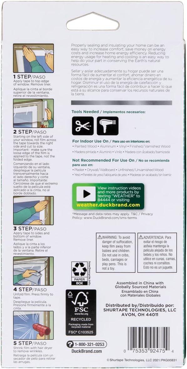 - ערכת החלונות כוללת 2 גלילי ניילון מתכווץ בגודל 62 אינץ' x 210 אינץ' ו-2 גלילי סרט דביק בגודל 0.5 אינץ' x 83 רגל; יכולה לבודד עד 10 חלונות בגודל סטנדרטי של 3' x 5'.