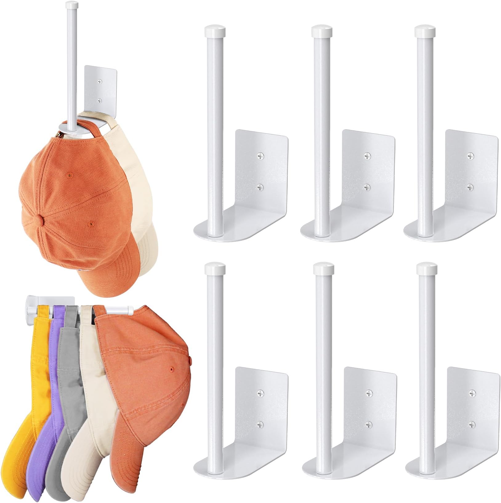 Durmmur חבילה של 6 מתלים לכובעי בייסבול, ארגונית כובעים מפלדת אל-חלד לכובעי בייסבול, מארגן אחסון כובעים, קולב כובעים עם דבק חזק/קדוח בקיר לדלת, חדר שינה, ארון (לבן 6 אינץ')