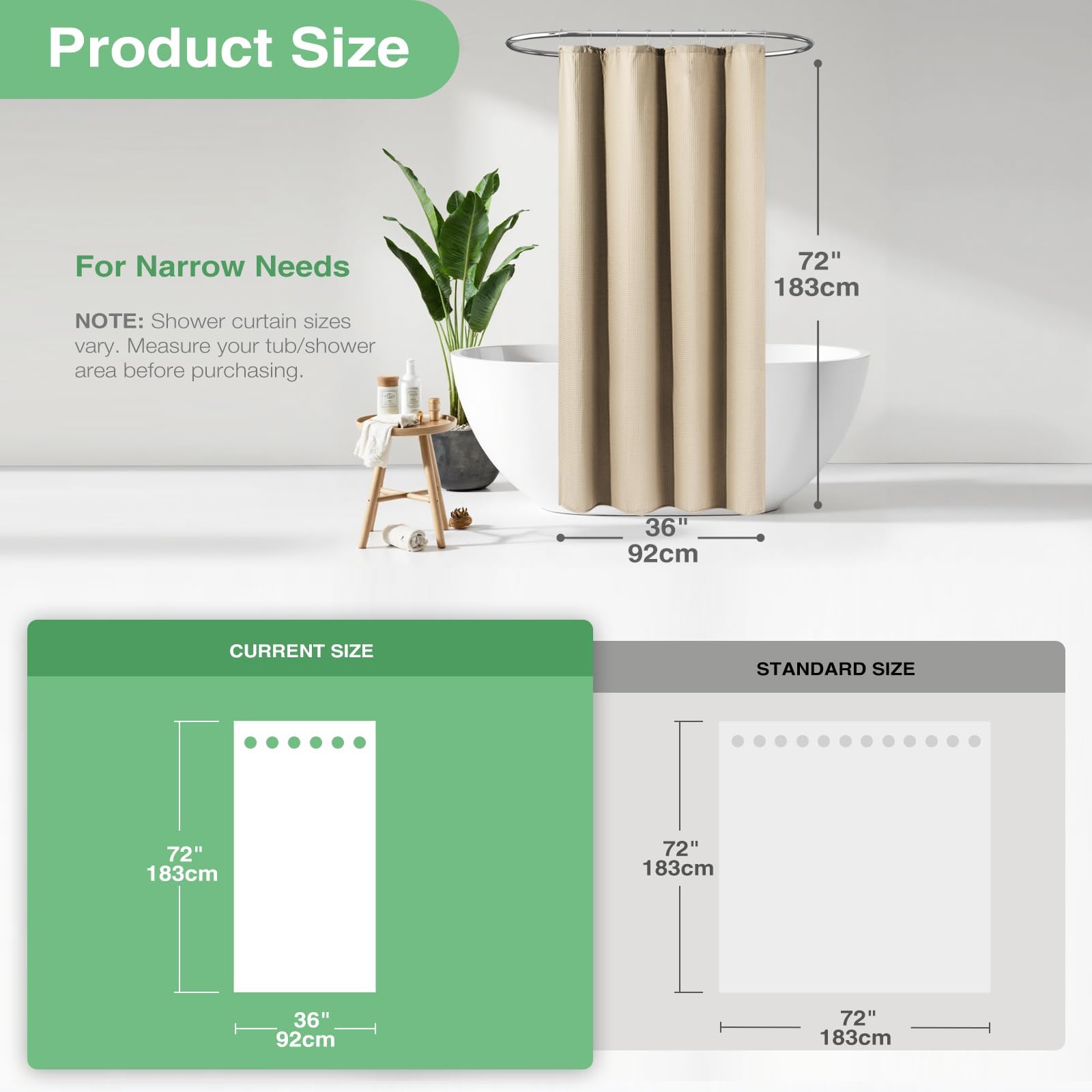 - 🚿【מידות】36W * 72H אינץ'; 256GSM (גרם למטר רבוע), כ-1.1 פאונד כבד יותר מוילונות מקלחת רגילים מבד 90GSM; 6 לולאות עמידות בפני חלודה המתאים לרוב ווים או טבעות סטנדרטיים למקלחת. החבילה כוללת וילון מקלחת וופל בז' אחד ו-6 ווים מפלסטיק.