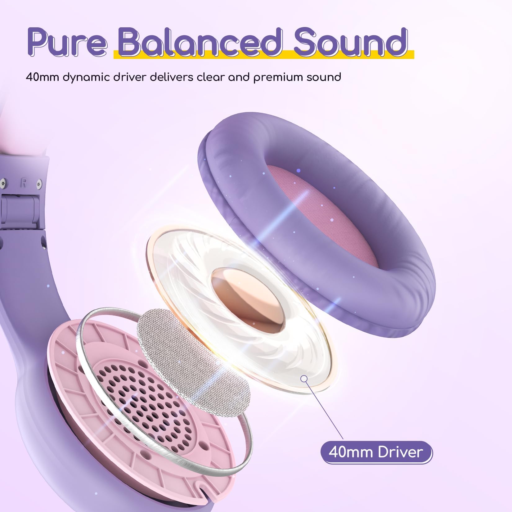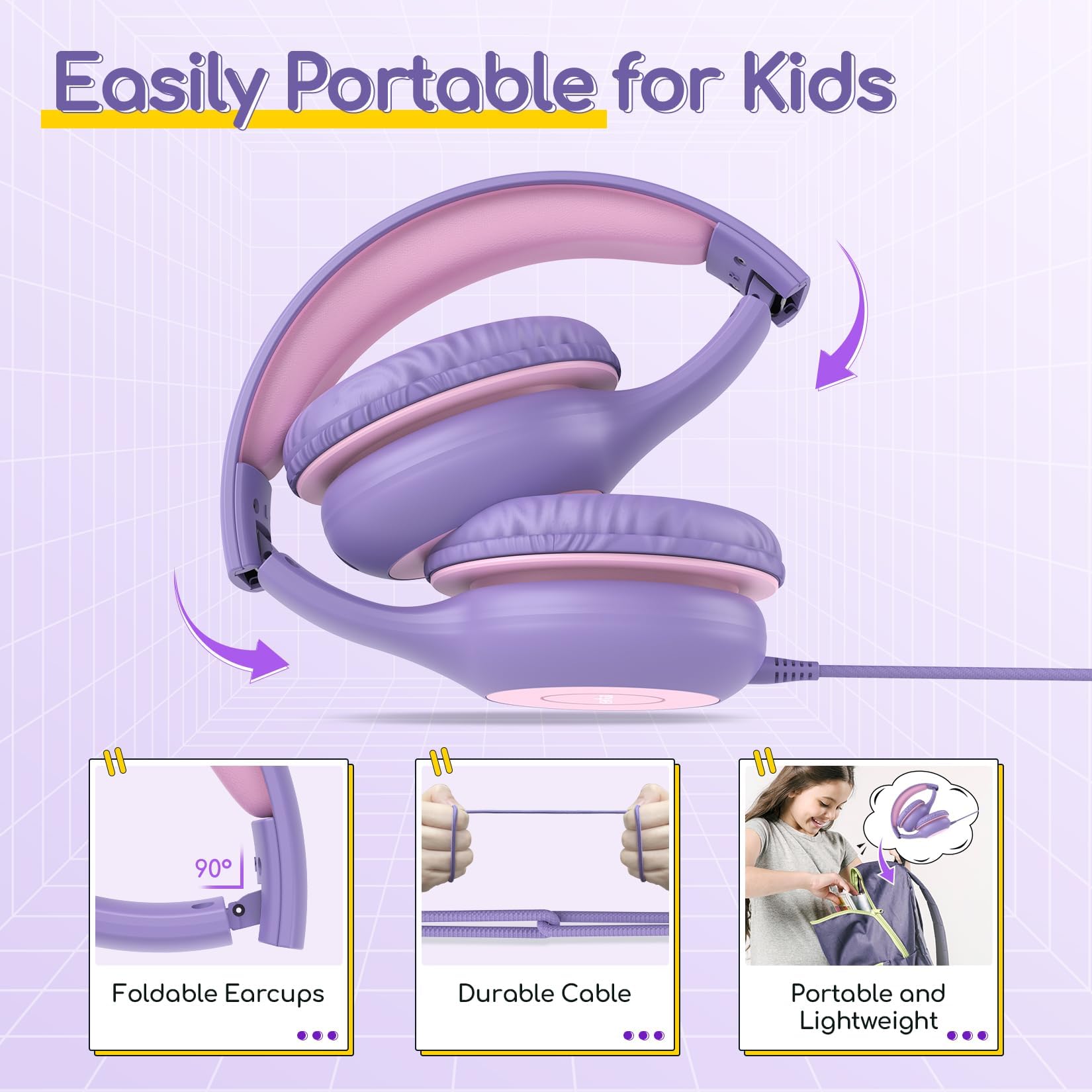 אוזניות EarFun לילדים עם מיקרופון, אוזניות עם הגבלת עוצמה 85/94dB לילדים, אוזניות ניידות עם Shareport, אוזניות מתקפלות עם צליל סטריאו לבית הספר/טאבלט/אייפד, ורוד סגול