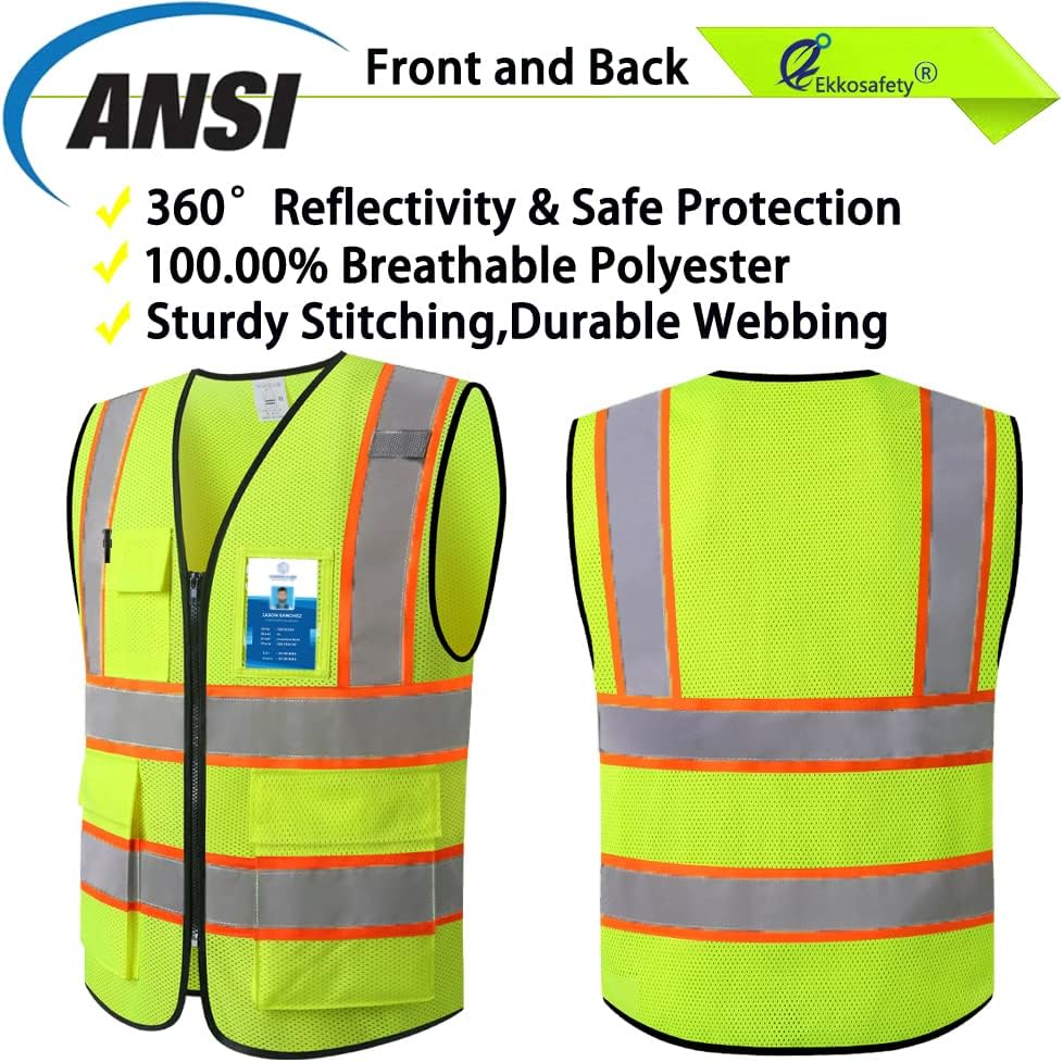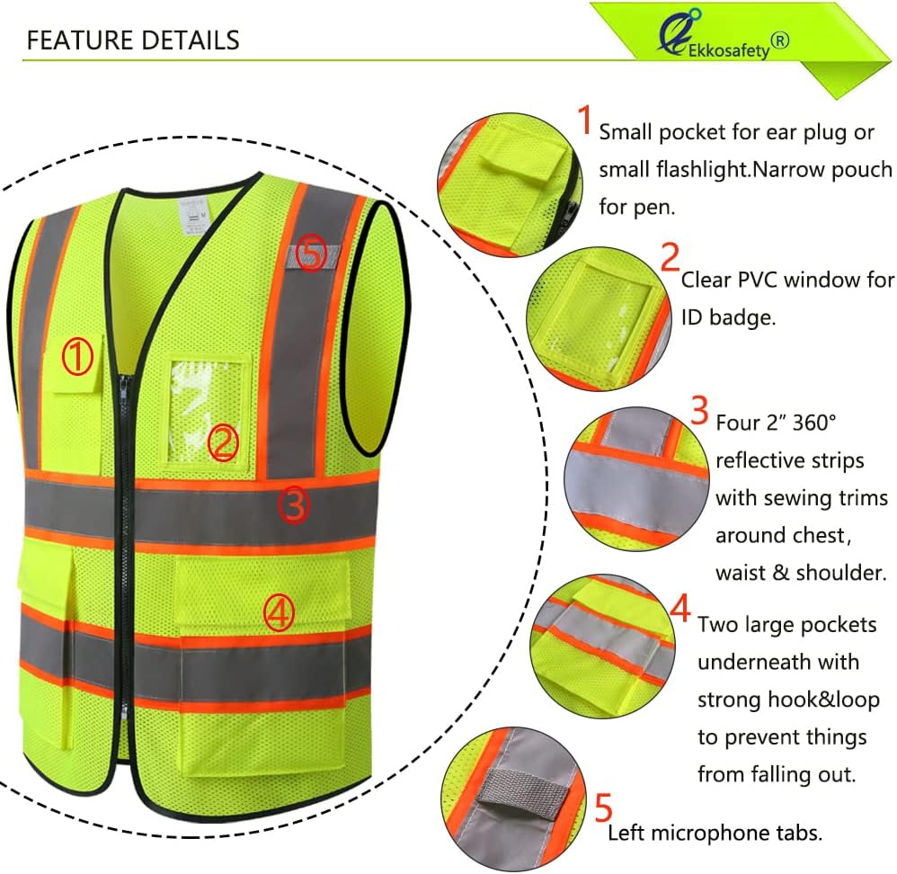 אפוד בטיחות מרשת מחזיר אור של Ekkosafety לגברים ונשים עם 5 כיסים ורוכסן קדמי, אפוד רשת בעל נראות גבוהה, אפוד עבודה בבנייה, עומד בתקני ANSI/ISEA (EK175-צהוב-L)