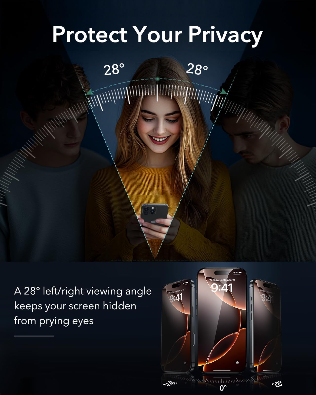 - הגנה עוצמתית על פרטיות: מסנן פרטיות מתקדם חוסם תצוגות מזוויות גדולות מ-28°, ושומר על מה שמופיע על מסכי ה-iPhone 16 Pro Max שלך גלוי רק לך.