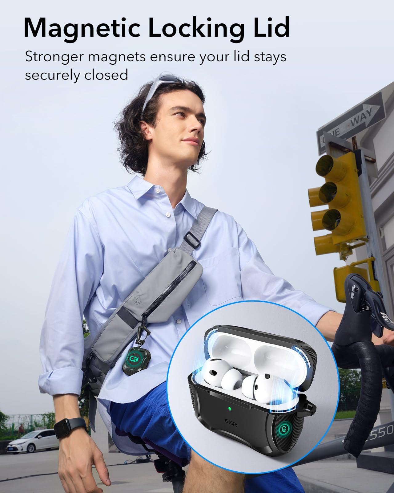 כיסוי ESR לאיירפודס פרו 3 (2025), תואם לאיירפודס פרו דור שלישי (כבל USB-C), מכסה מגנטי, מוכן ל-MagSafe, הגנה חזקה מפני נפילות, סדרת Cyber, שחור