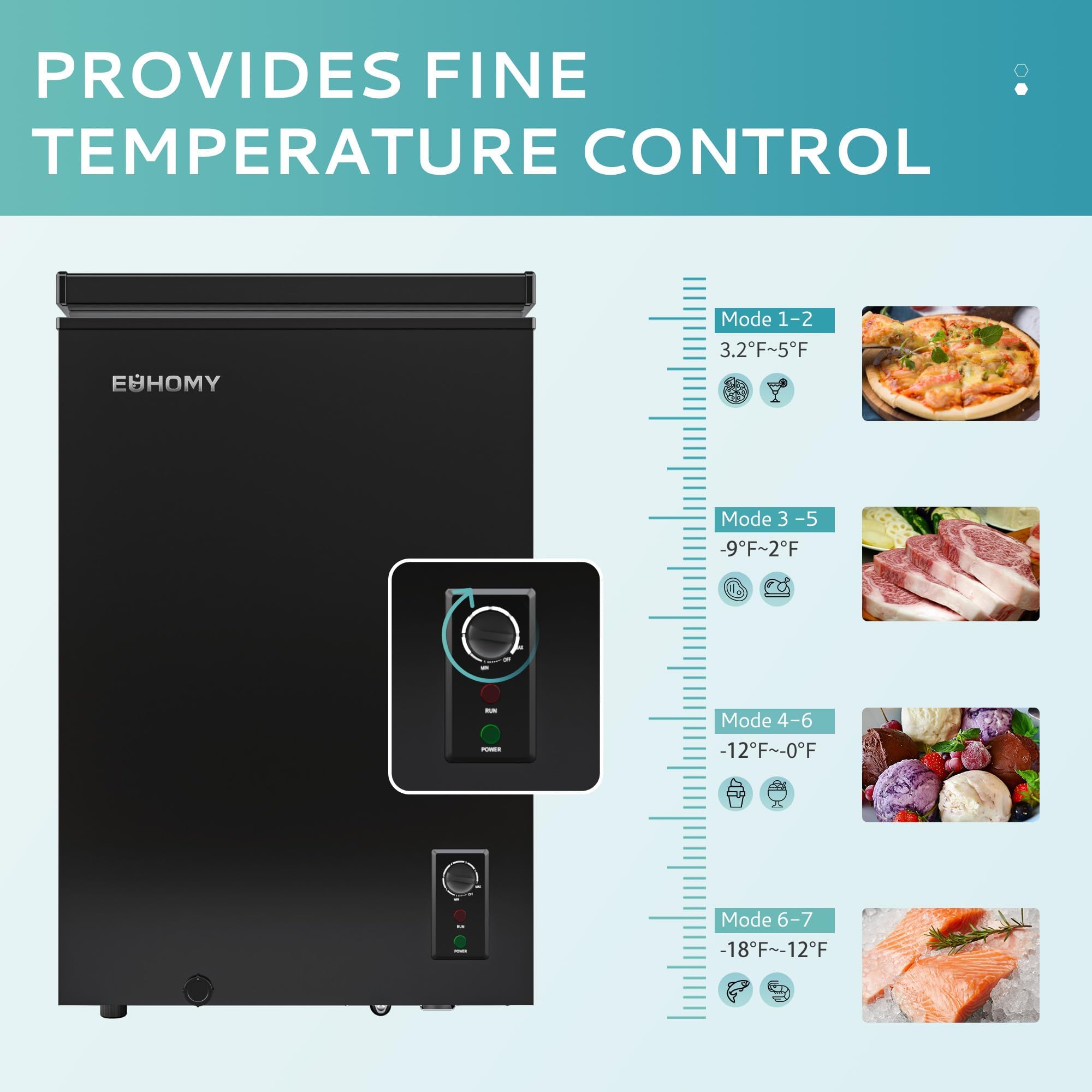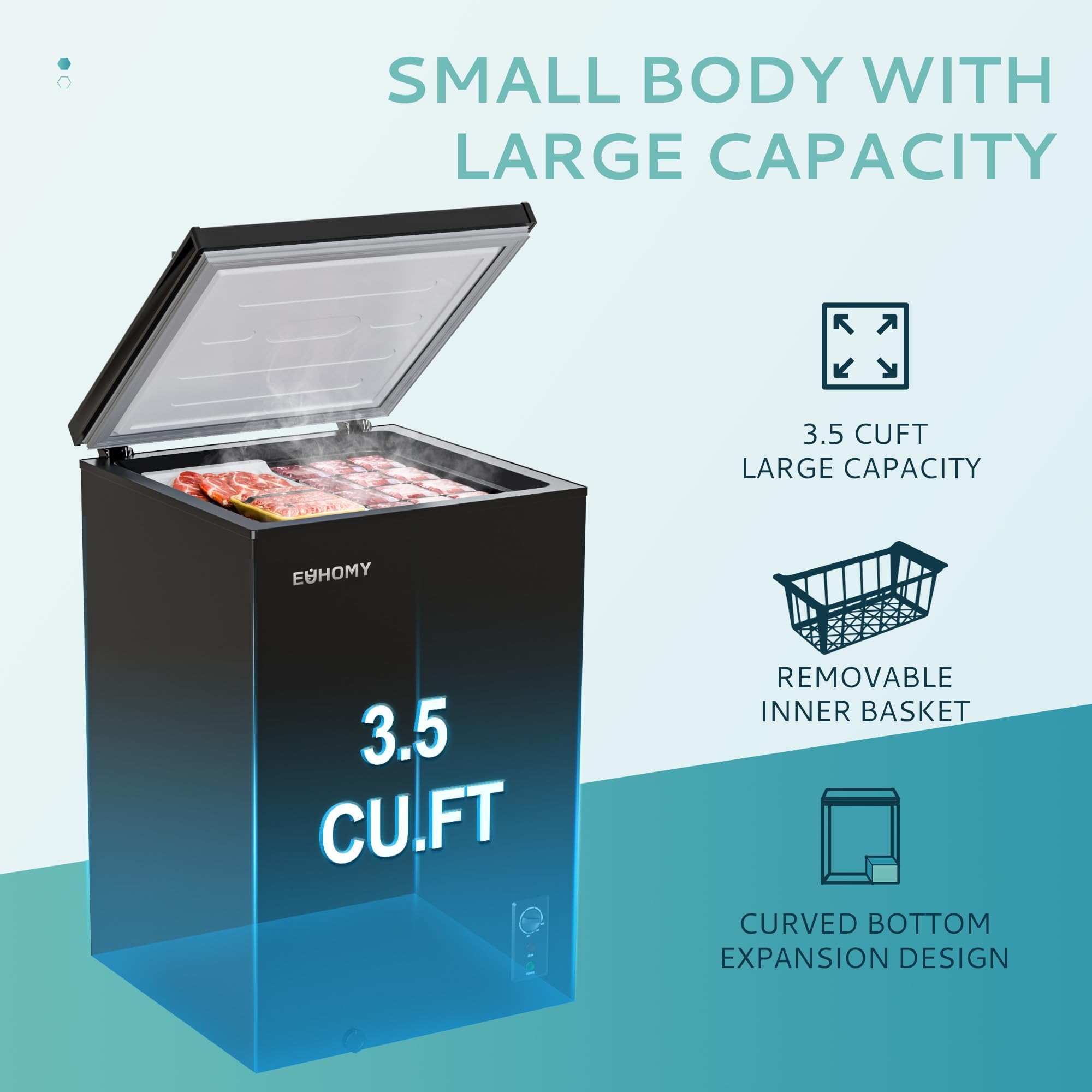 - שילוב קיבולת וגודל - מקפיא Euhomy דורש שטח קטן של 2.8 רגל רבוע בלבד ומתאים לפינות של רוב המטבחים, הדירות, חדרי האוכל והמוסכים. הגודל הקומפקטי: 21.5 אינץ' (רוחב) x 18.7 אינץ' (עומק) x 32.7 אינץ' (גובה) מאפשר למקפיא העמוק להתאים לארונות, והקיבולת הפנימית הגדולה של 3.5 רגל מעוקב יכולה להכיל כ-33 פאונד של בשר בקר ו-48 פאונד של דגים, מספיק כדי לענות על הצרכים היומיומיים.