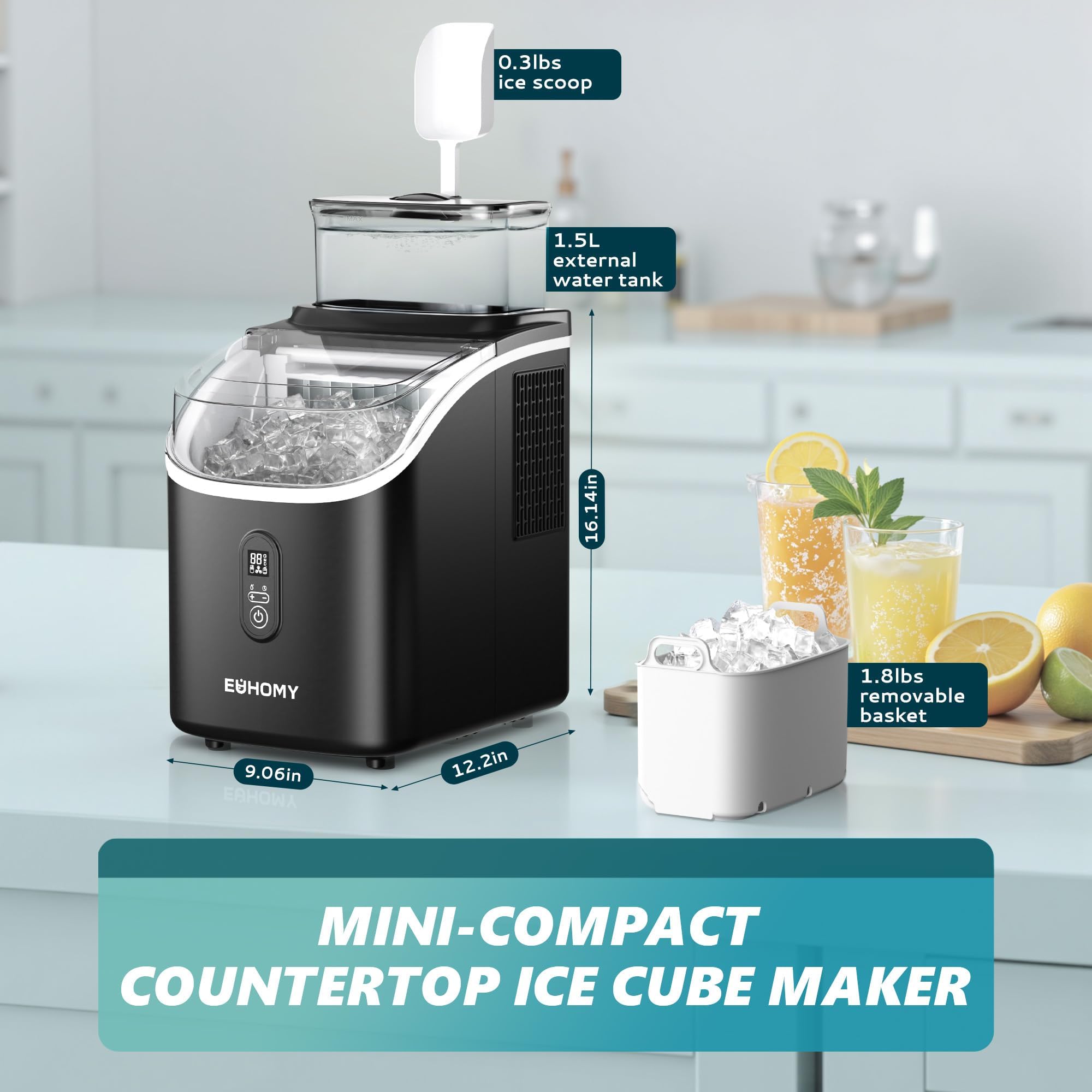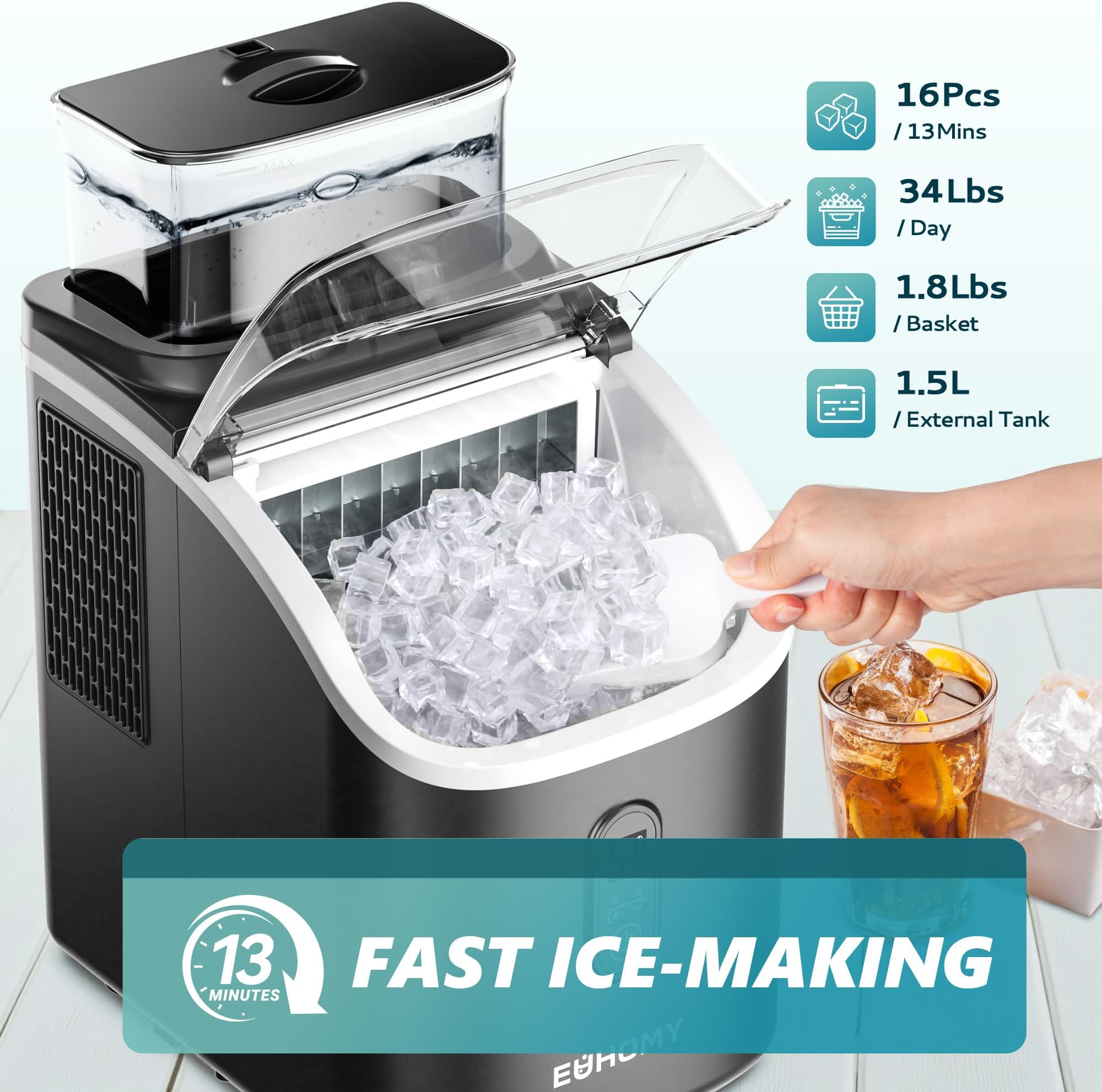 מכונת קוביות קרח EUHOMY משטח עבודה עם מיכל מים חיצוני, 2 דרכים להוספת מים, 14 ק"ג/יום, 16 יחידות מוכנות תוך 7 דקות, ניקוי אוטומטי, עם כף קרח וסלסלת, לבית/מטבח/משרד/בר (שחור)