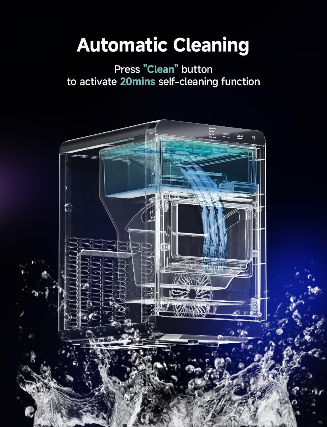 - מערכת ניקוי עצמי חכמה: משטח העבודה של מכונת הקרח EUHOMY כולל תוכנית ניקוי אוטומטית. בלחיצה אחת בלבד על כפתור "CLEAN", תיהנו ממחזור ניקוי יסודי של 20 דקות ללא צורך בקרצוף ידני נוסף. תחזוקה קלה וקלה.
