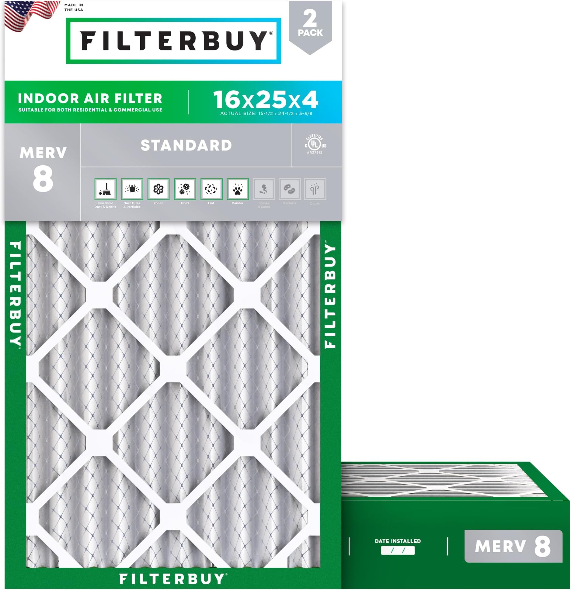 מסנן אוויר Filterbuy 16x25x4 MERV 8 Essential Dust & Allergy Defense (חבילה של 2), תחליף למסנני תנור AC HVAC עם קפלים אלקטרוסטטיים, תוצרת ארה"ב (גודל אמיתי: 15.50 x 24.50 x 3.63)