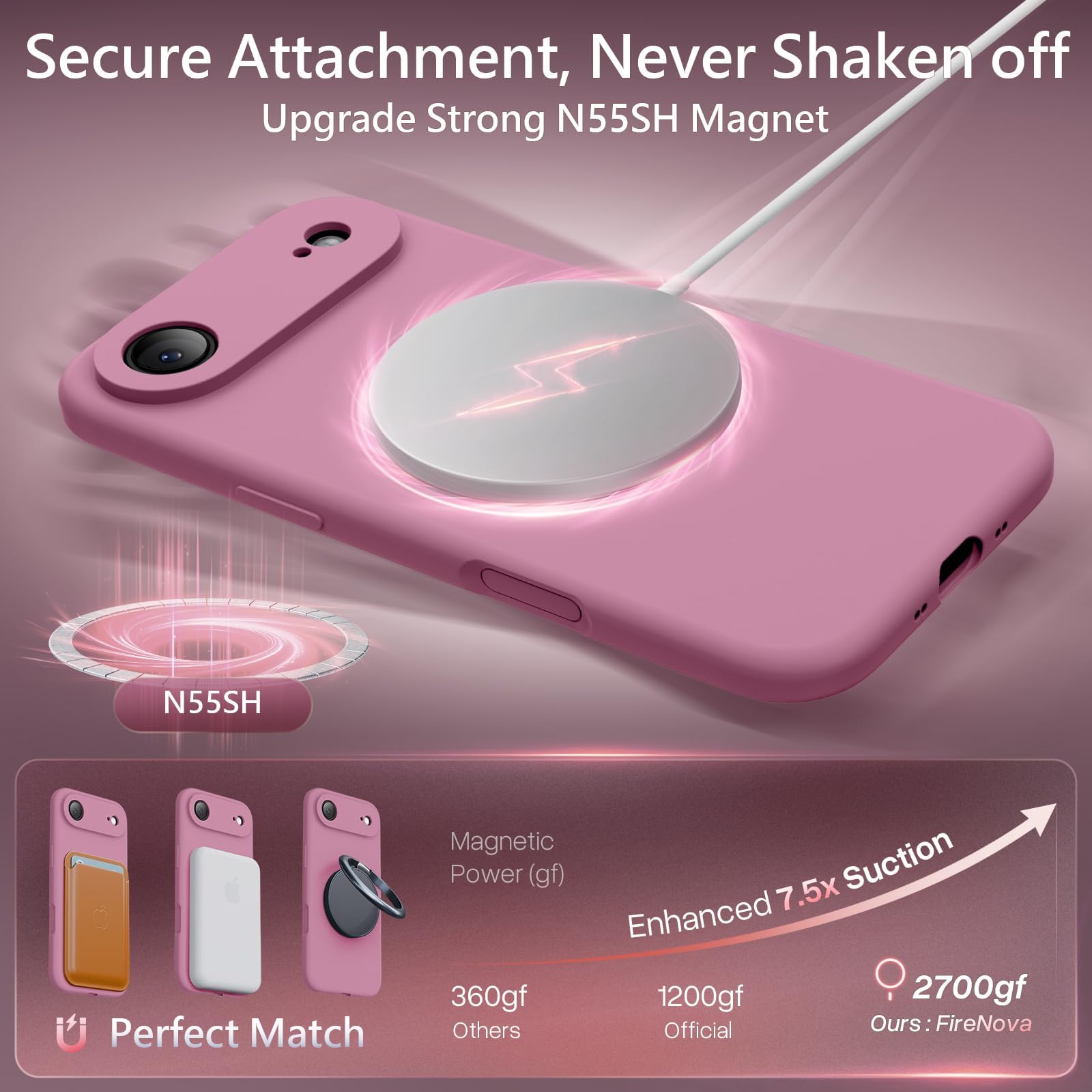 - מגנטים חזקים במיוחד מדגם N55SH: מספקים יניקה חזקה פי 7.5 מהכיסוי הרגיל לאייפון אייר. תואם לכל סוגי ה-MagSafe, מבטיח חיבור יציב לתושבות מגנטיות לרכב, מטענים מגנטיים וארנקים וכו'. מאפשר טעינה אלחוטית מהירה ובטוחה יותר.