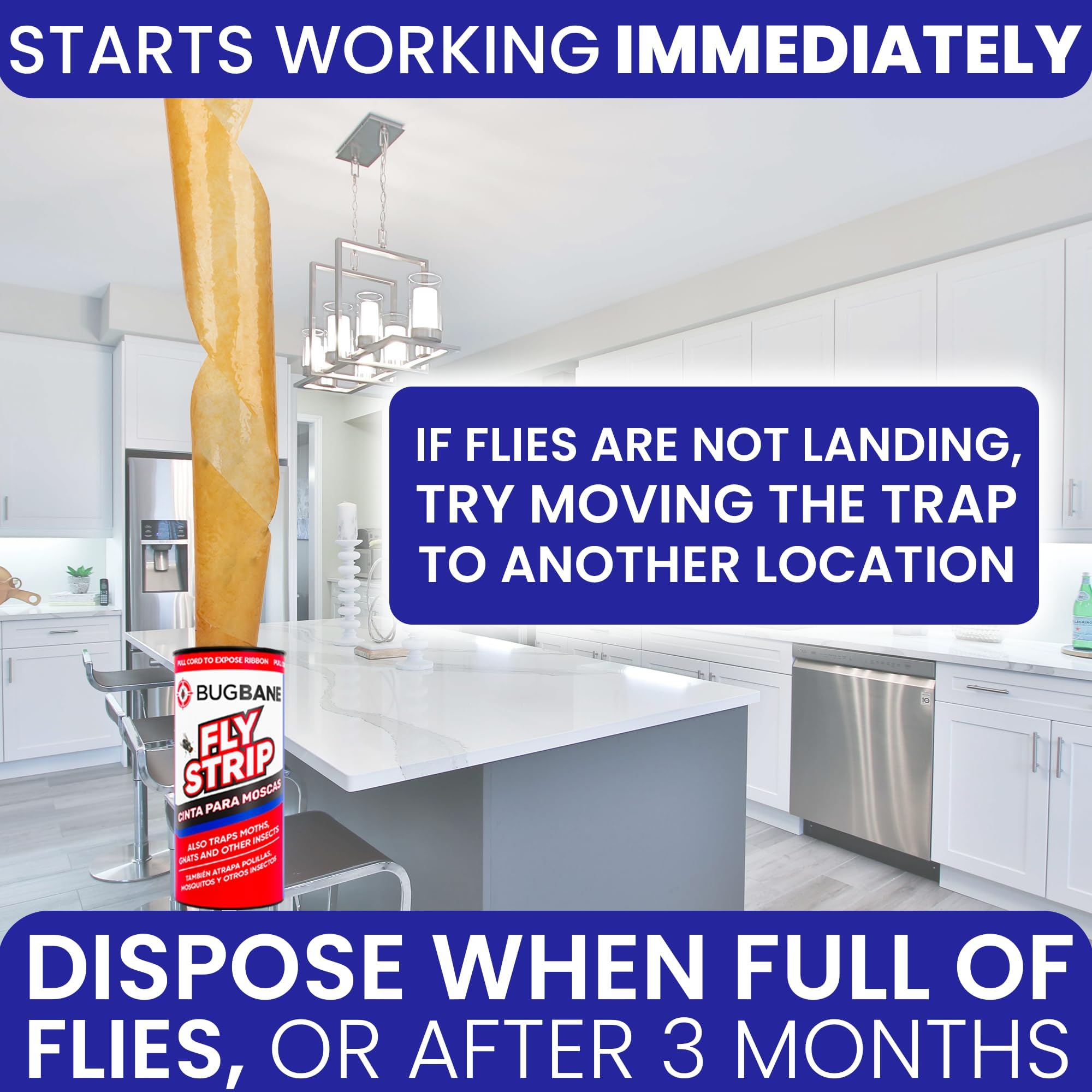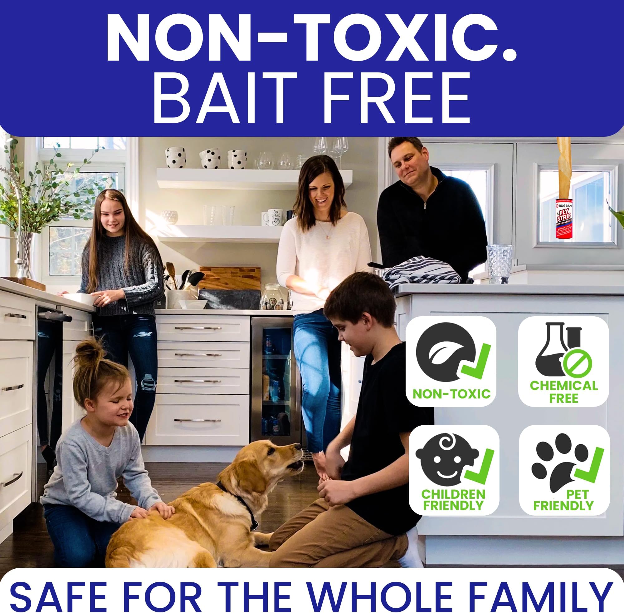 - לא רעיל. ללא ריחות וללא פיתיונות. שלא כמו מלכודות זבובים דביקות רבות, סרט הזבובים שלנו לשימוש ביתי אינו מכיל פיתיון והוא בטוח לכולם. רק וודאו שלא לגעת בחלק הדביק של רצועות נייר הזבובים.