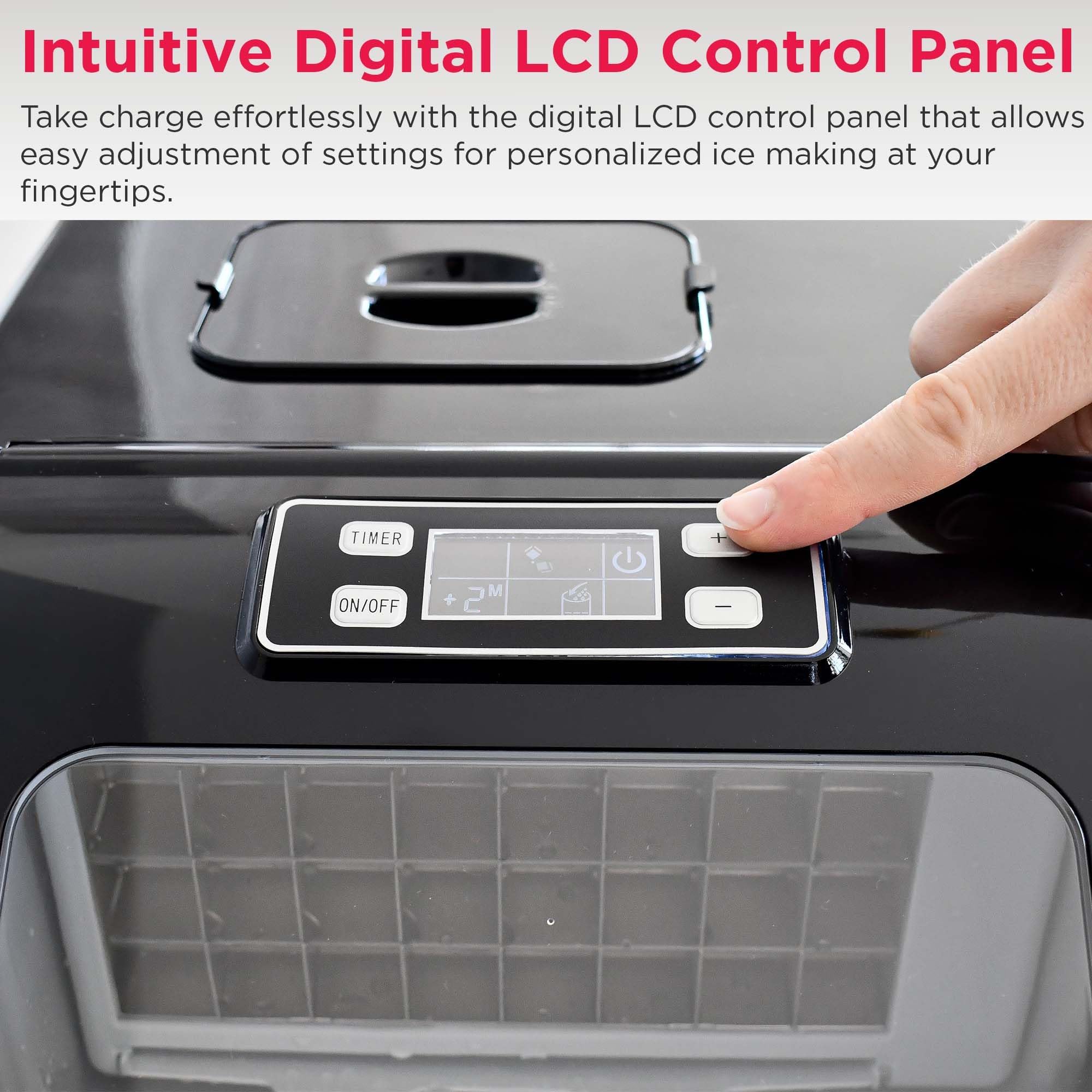 - שליטה אינטואיטיבית: מכונת קוביות הקרח בעלת קיבולת גדולה במיוחד כוללת חלון שקוף המאפשר לכם לנטר בקלות את רמות הקרח ולראות מתי הקרח מיוצר. קחו שליטה מלאה עם לוח הבקרה הדיגיטלי LCD