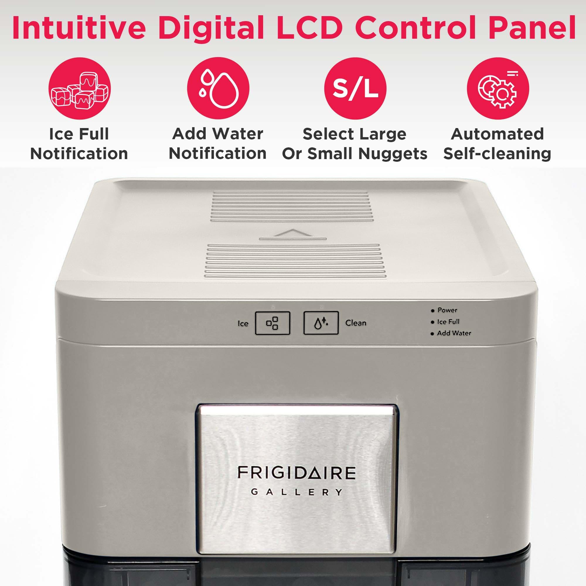 מכונת קרח הנאגט החדשה ביותר של Frigidaire Gallery מייצרת קרח נאגטס לעיס, פריך ואוורירי עם מרקם ייחודי בדיוק כמו שעושות מסעדות! מכונת הקרח הנאגטס בסגנון עכשווי שלנו מייצרת עד 20 ק"ג של קרח טרי ביום וכוללת מיכל גדול המכיל עד 1.5 ק"ג של קרח נאגטס פריך. התחילו ליהנות מהמנה הראשונה של קרח תוך 10 דקות או פחות עם הייצור המהיר של מכונת קרח זו. מכונת קרח זו כוללת מיכל מובנה, מה שמפחית את הצורך במילוי מים תכוף בזמן דרישה גבוהה. עיצוב חדשני ופרטים חדשניים כמו לוח בקרה עם מסך מגע משפרים את מכונת הקרח הנקי והמודרנית הזו. מצב הניקוי העצמי המובנה מסייע בהגבלת חיידקים והופך את הניקוי לקליל, כך שתמיד יהיה לכם קרח טרי וטרי! הגודל המושלם לכל משטח עבודה בביתכם, שכן הוא מתאים מתחת לארונות המטבח שלכם.
