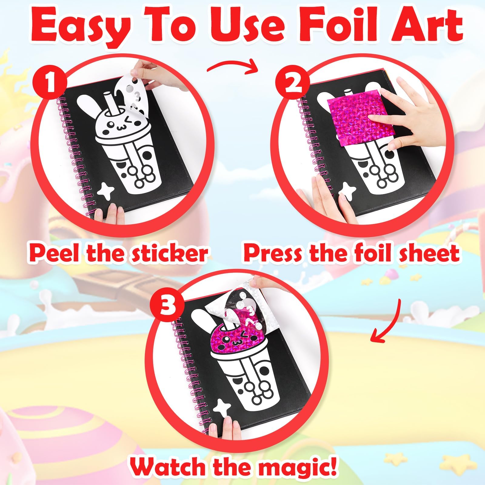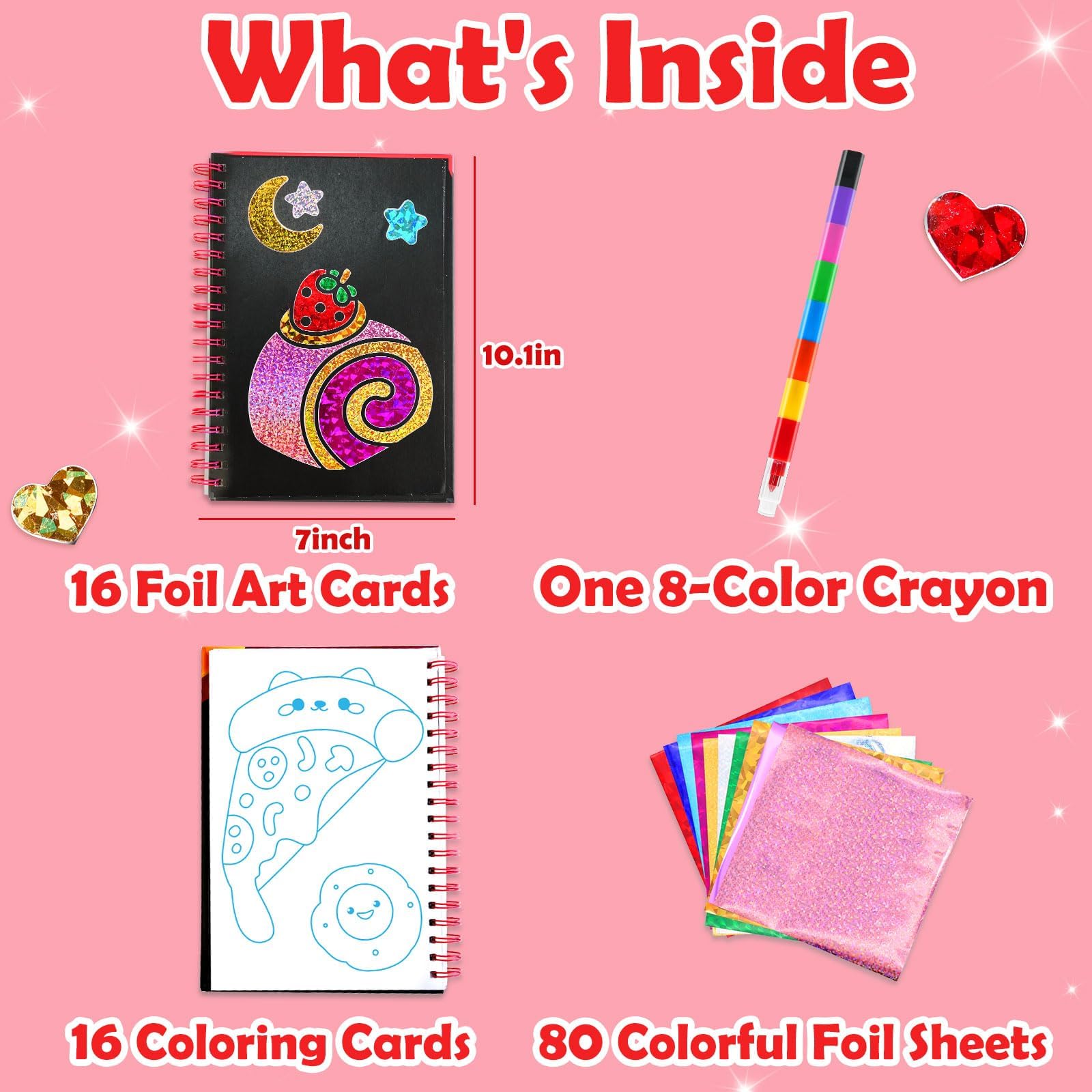 - 💖סט יצירות נייר כסף קל לשימוש: ערכת פעילות נייר כסף כוללת 80 דפי נייר כסף צבעוניים, עפרון צבע אחד בן 8 צבעים, 16 כרטיסי נייר כסף ו-16 כרטיסי צביעה; בחרו את הדוגמה וקילפו את הסרט המגן, השתמשו בנייר כסף נצנצים כדי לצבוע את החלקים הדביקים שנבחרו ולחצו; הוסיפו כמה שיותר צבעים של נייר כסף במהלך התהליך, ויצירת דוגמה צבעונית מושלמת! יצירות נייר כסף בכמות גדולה מושלמות להעסקת ילדכם ולגירוי היצירתיות שלו.