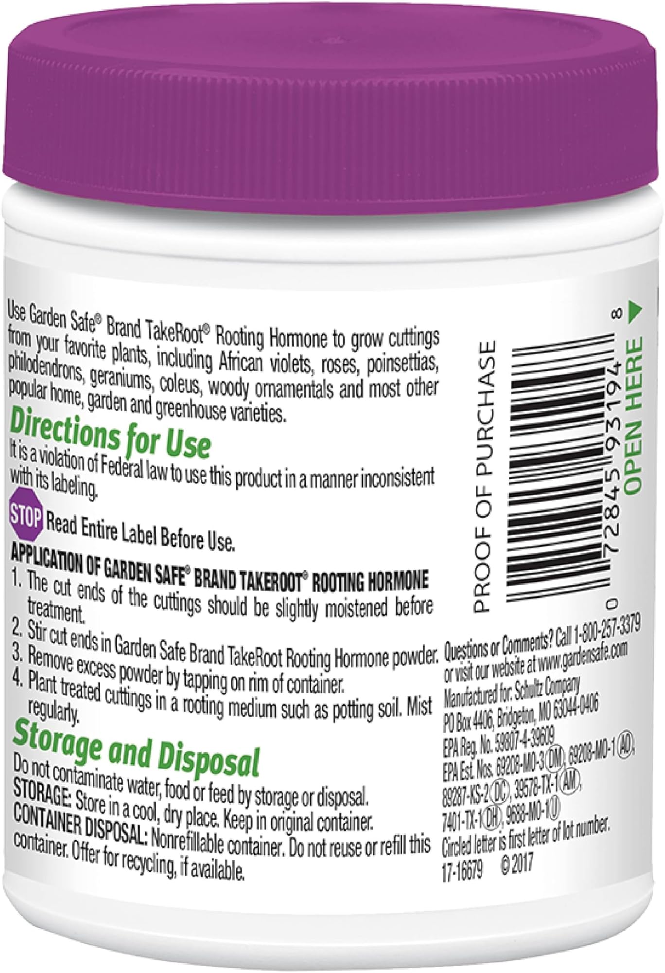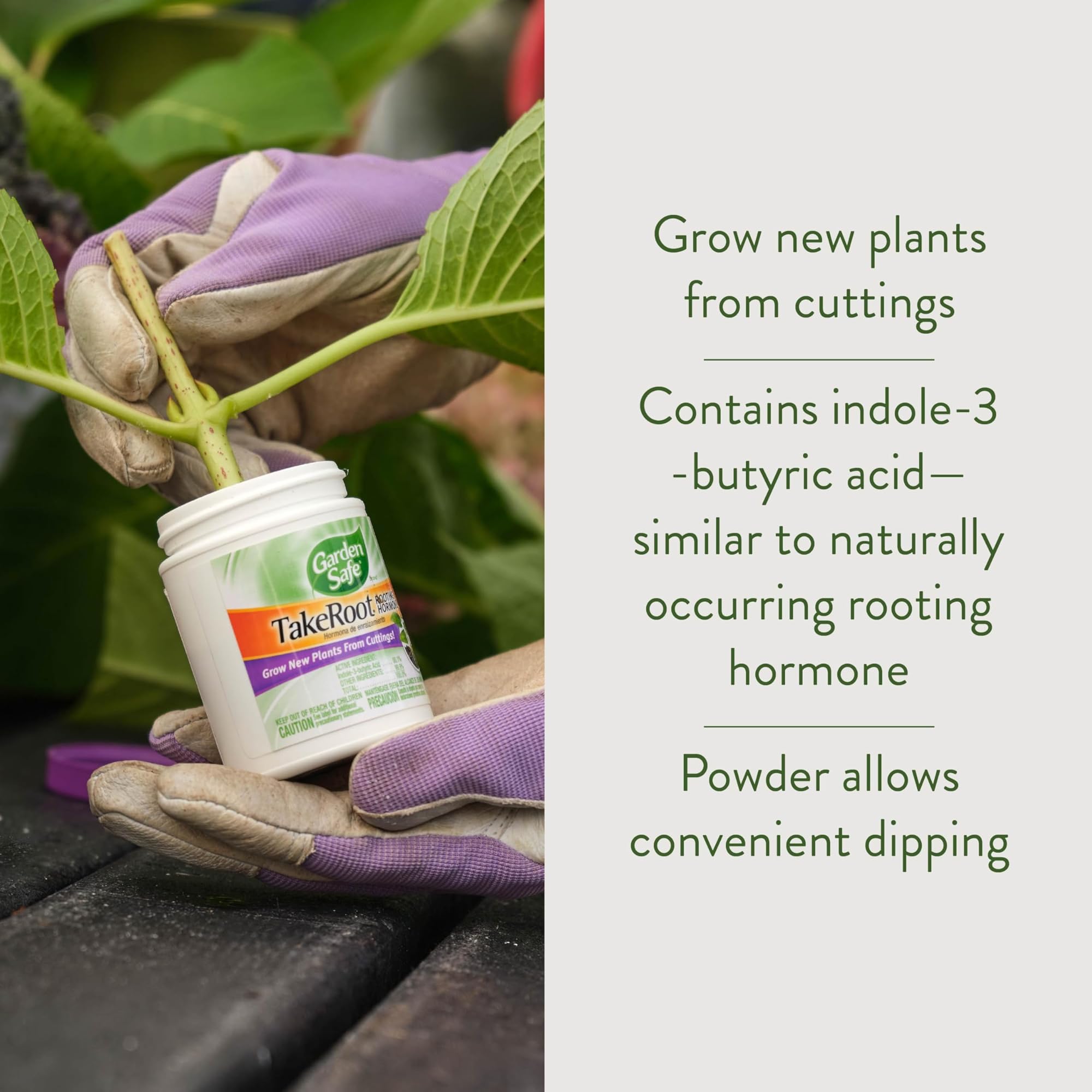 השתמשו בהורמון ההשרשה TakeRoot של המותג Garden Safe כדי לגדל ייחורים מהצמחים האהובים עליכם, כולל סיגליות אפריקאיות, ורדים, פוינסטיות, פילודנדרונים, גרניום, קולאוס, צמחי נוי עציים ורוב הזנים הפופולריים האחרים לבית, לגינה ולחממה. החומר הפעיל, חומצה אינדול-3-בוטירית, מקדם את התפתחות השורשים ברוב הזנים הפופולריים של צמחי הבית, לגינה ולחממה. מרכיב זה דומה להורמון ההשרשה המופיע באופן טבעי בצמחים, חומצה אינדול-3-אצטית. יש לקרוא תמיד את התווית כולה ולפעול לפי כל ההוראות ואמצעי הזהירות.