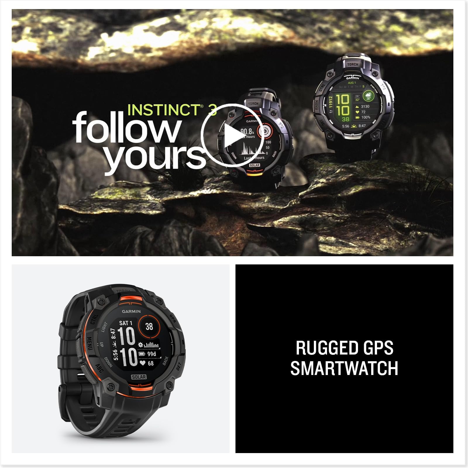Instinct® 3 is the rugged 45 mm GPS smartwatch with a 0.9” display, built-in flashlight and unlimited battery life in smartwatch mode with solar charging (assumes all-day wear with 3 hours per day outside in 50,000 lux conditions). With bolted construction, a metal-reinforced bezel and scratch-resistant lens, it can take on your toughest adventures. It’s engineered to MIL-STD-810 standards for thermal and shock resistance and is also 10 ATM water-rated. To keep you on track, the Instinct 3 smartwatch includes a built-in 3-axis compass and barometric altimeter. Plus, multi-band GPS with SatIQ™ technology delivers superior positioning while also optimizing battery life. Its 24/7 health and wellness features keep you connected to your body with heart rate tracking, advanced sleep monitoring, Pulse Ox and more (this is not a medical device, and data presented is intended to be a close estimation of metrics tracked; Pulse Ox not available in all countries). Instinct 3 also includes Garmin Pay™ contactless payments (with a supported bank).