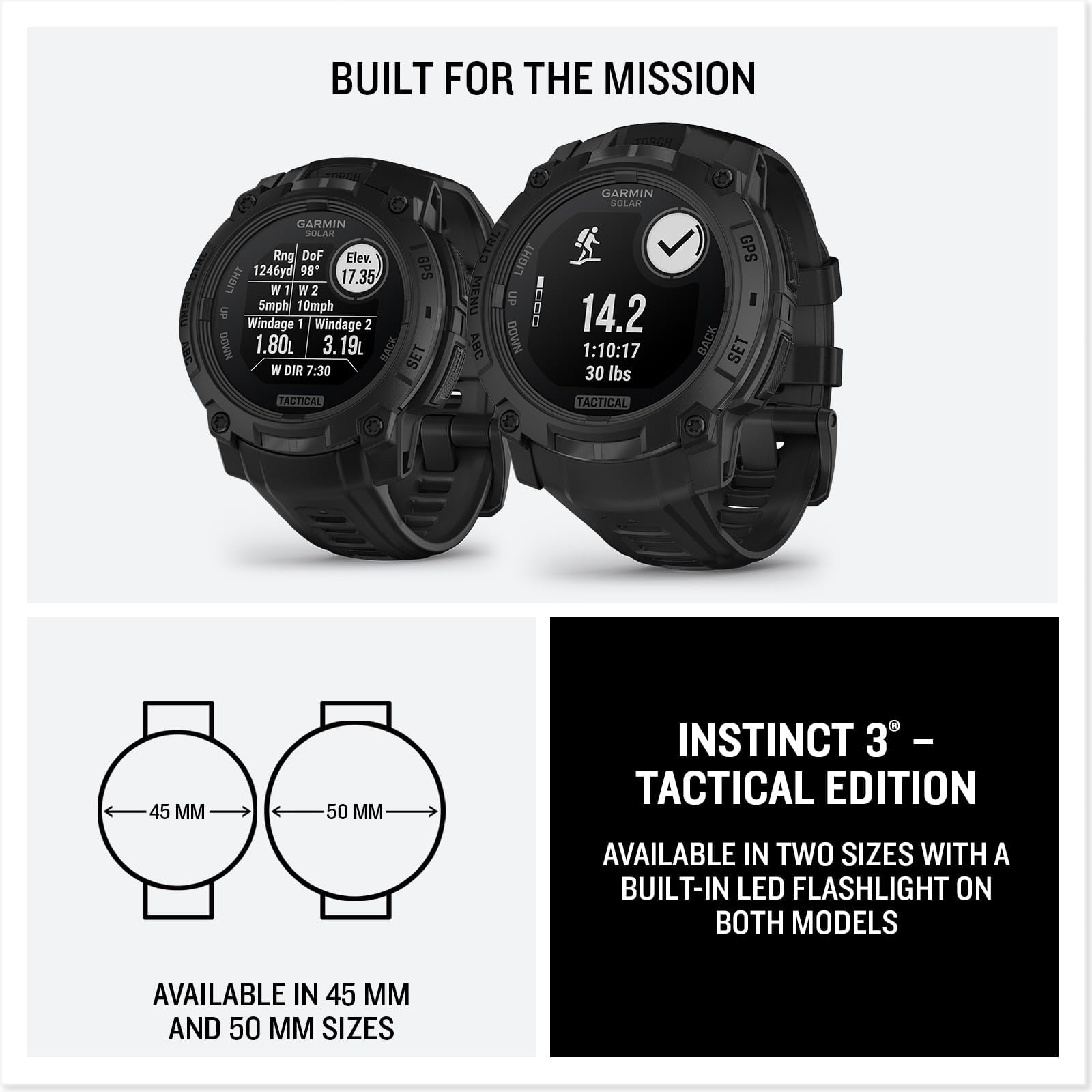 Dare for more with Instinct® 3 – Tactical Edition, the rugged GPS smartwatch with solar charging for unlimited battery life (assumes all-day wear in smartwatch mode with 3 hours per day outside in 50,000 lux conditions) and a built-in flashlight. With a bolted construction, metal-reinforced bezel and scratch-resistant lens, it can take on the toughest missions. It’s engineered to MIL-STD-810 standards for thermal and shock resistance and is also 10 ATM water-rated. Purpose-built tactical features include a rucking activity, stealth mode, kill switch and preloaded Applied Ballistics® solver (requires one-time purchase via the AB Quantum mobile app). Stay on track with a built-in 3-axis compass and barometric altimeter as well as multi-band GPS with SatIQ™ technology, which delivers superior positioning while also optimizing battery life. Its 24/7 health and wellness features keep you connected to your body with heart rate tracking, advanced sleep monitoring, Pulse Ox and more (this is not a medical device, and data presented is intended to be a close estimation of metrics tracked; Pulse Ox not available in all countries).