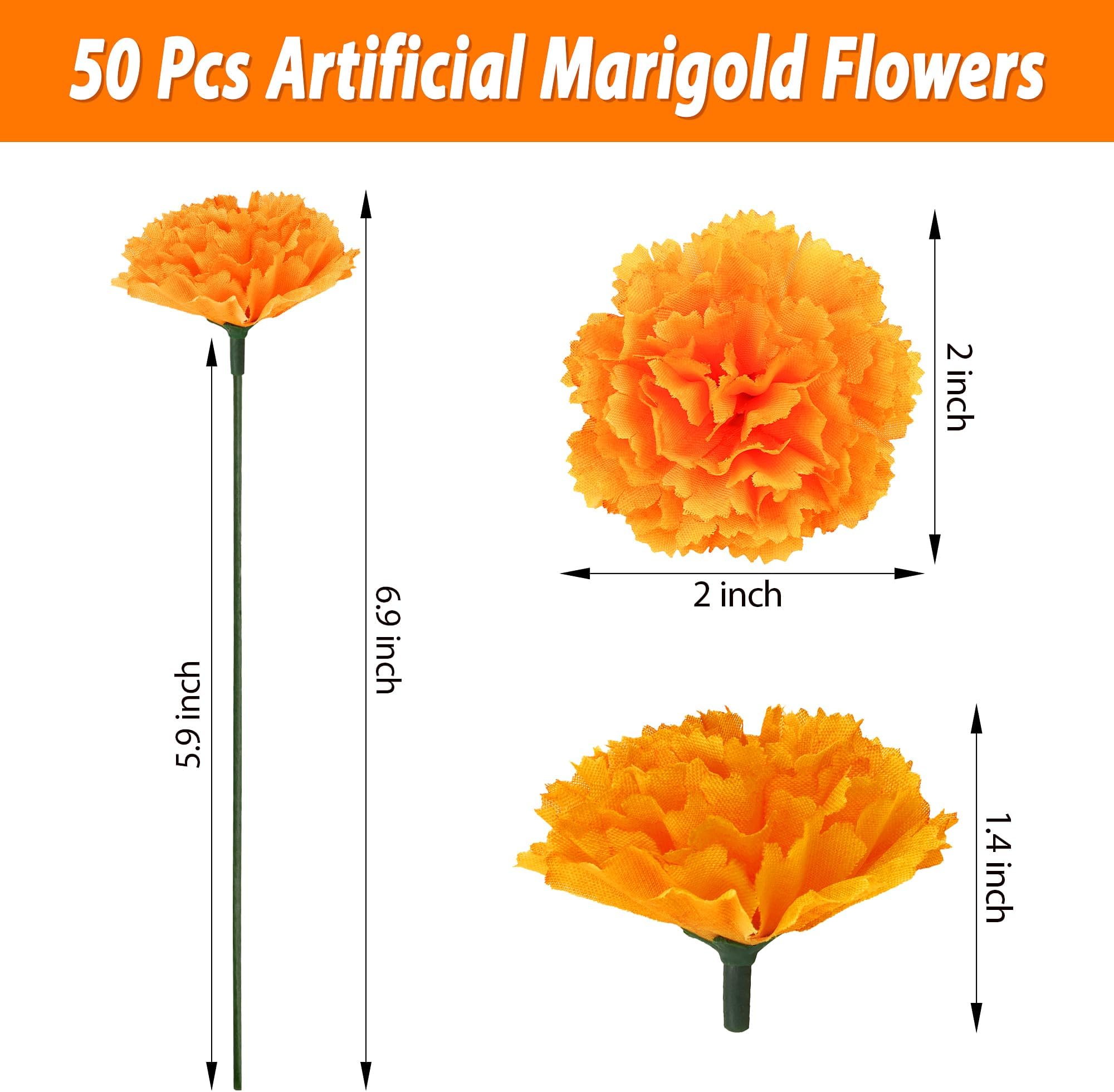 GOMALL 50 יחידות פרחי ציפורני חתול מלאכותיים, ראשי פרחי ציפורני חתול משי 2 אינץ' עם גבעולים, פרחים כתומים מלאכותיים לקישוט דיוואלי, חתונה הודית, בית, זר DIY, קישוטי יום המתים