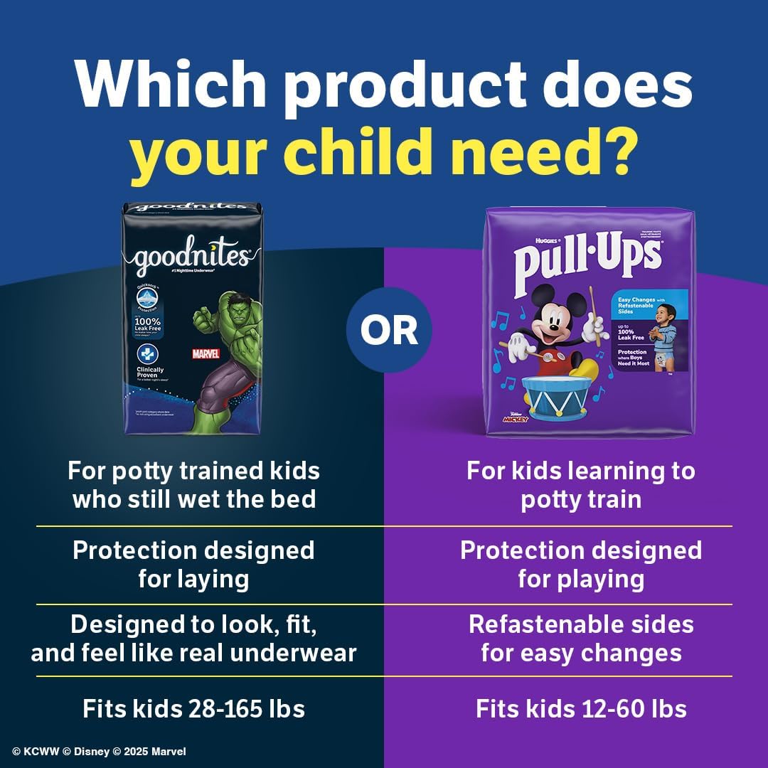 עזרו לילדיכם להתעורר יבשים עם תחתוני הלילה של Goodnites, תחתוני הלילה מספר 1.* תחתוני הלילה הללו עשויים עם Quicksorb Protection ללילה ללא דליפות עד 100%, לא משנה איך ילדכם ישן. תחתוני הלילה של Goodnites, שתוכננו במיוחד להרטבת לילה, הוכחו קלינית לשינה טובה יותר בלילה.** תחתוני הלילה של Goodnites לבנות מעוצבים להתאמה ללא פערים סביב הרגליים להגנה נוחה בלילה. ל-Goodnites יש הגנה אזורית לבנות, המספקת הגנה היכן שבנות זקוקות לה ביותר. לא רק זה, אלא ש-Goodnites מכילה 3 בקבוקי מים.*** בנוסף, תחתוני הרטבת הלילה של Goodnites כוללים חומר סופג ריחות. בנוסף, תחתונים חד פעמיים וסופגים אלה הם היפואלרגניים ואינם מכילים מרכיבים קשים. תחתוני הרטבת הלילה של Goodnites מספקים התאמה יוצאת דופן לילדים במשקל 120-165 פאונד. מוצרי Goodnites זמינים במידה XS (11-18 ק"ג), מידה S/M (18-24 ק"ג), מידה L (18-34 ק"ג), מידה XL (19-51 ק"ג) ומידה XXL (59-74 ק"ג). מוצרי Goodnites ללילה זכאים ל-FSA/HSA בארה"ב. (*נתוני שיתוף קטגוריית מכנסי נוער) (**לעומת אי לבישת תחתונים סופגים) (***שלושה בקבוקי מים של 225 מ"ל, סה"כ 615 מ"ל)