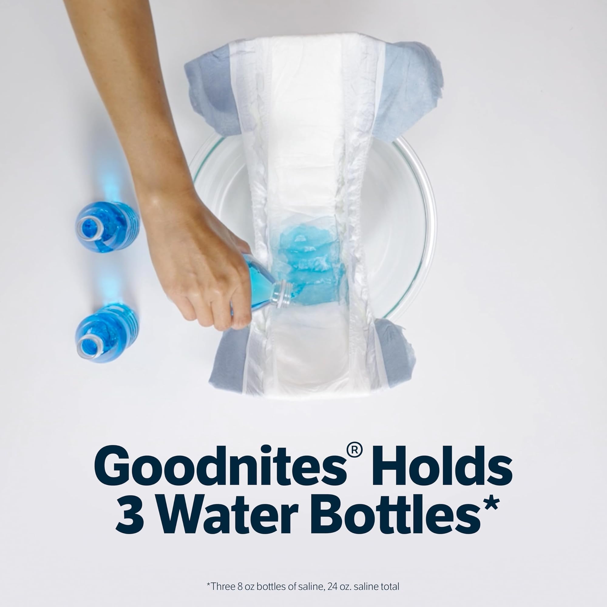 - תחתוני לילה של Goodnites מכילים שלושה בקבוקי מים*** (***שלושה בקבוקי תמיסת מלח של 227 מ"ל, סה"כ 614 מ"ל)