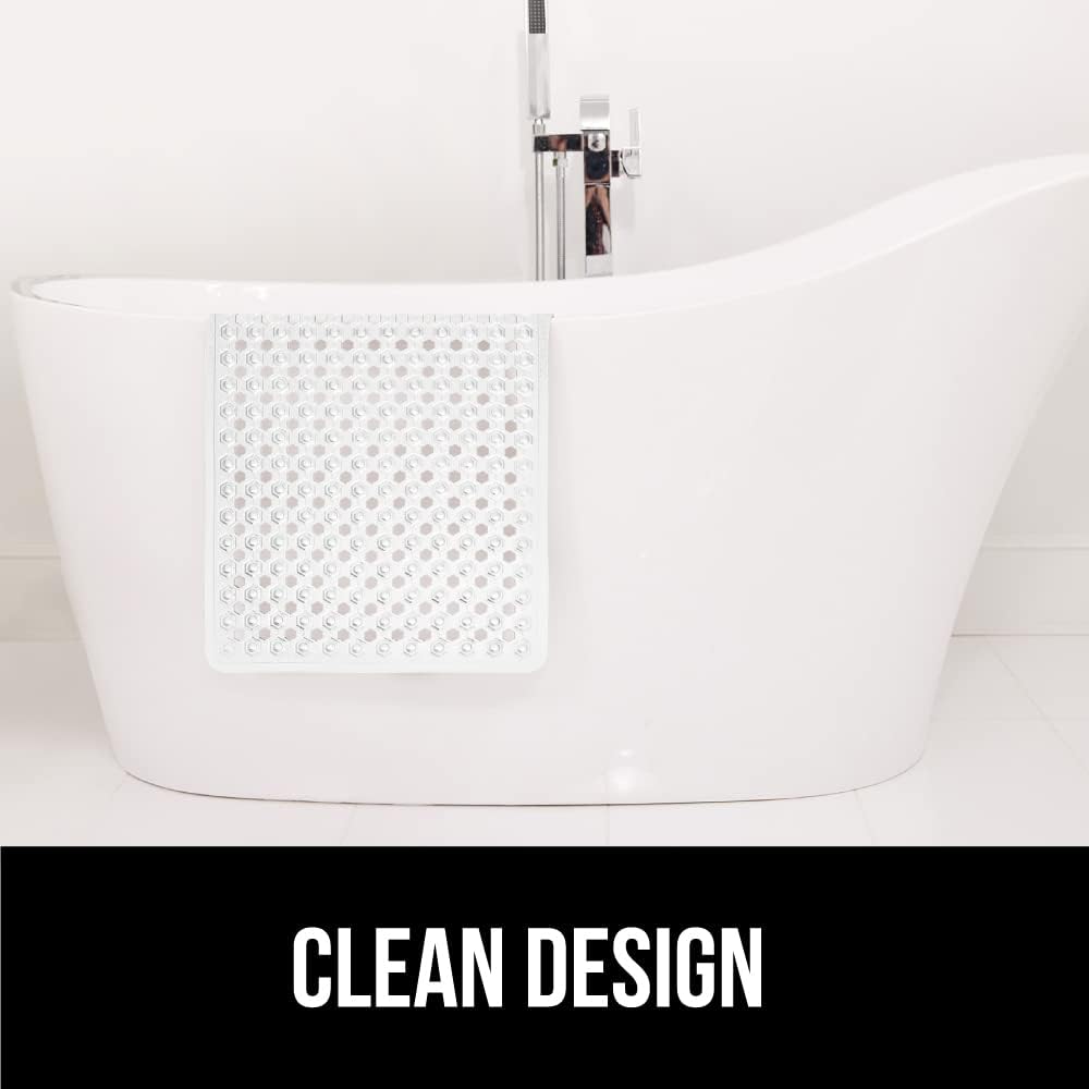 שטיחון מקלחת לאמבטיה פטנט GORILLA GRIP, שטיחי ריפוד אמבטיה הניתנים לכביסה במכונה, כוסות יניקה וחורי ניקוז לשמירה על ניקיון האמבטיות, רך על הרגליים, מוצרי אמבטיה חיוניים, 35x16 אינץ', שקוף