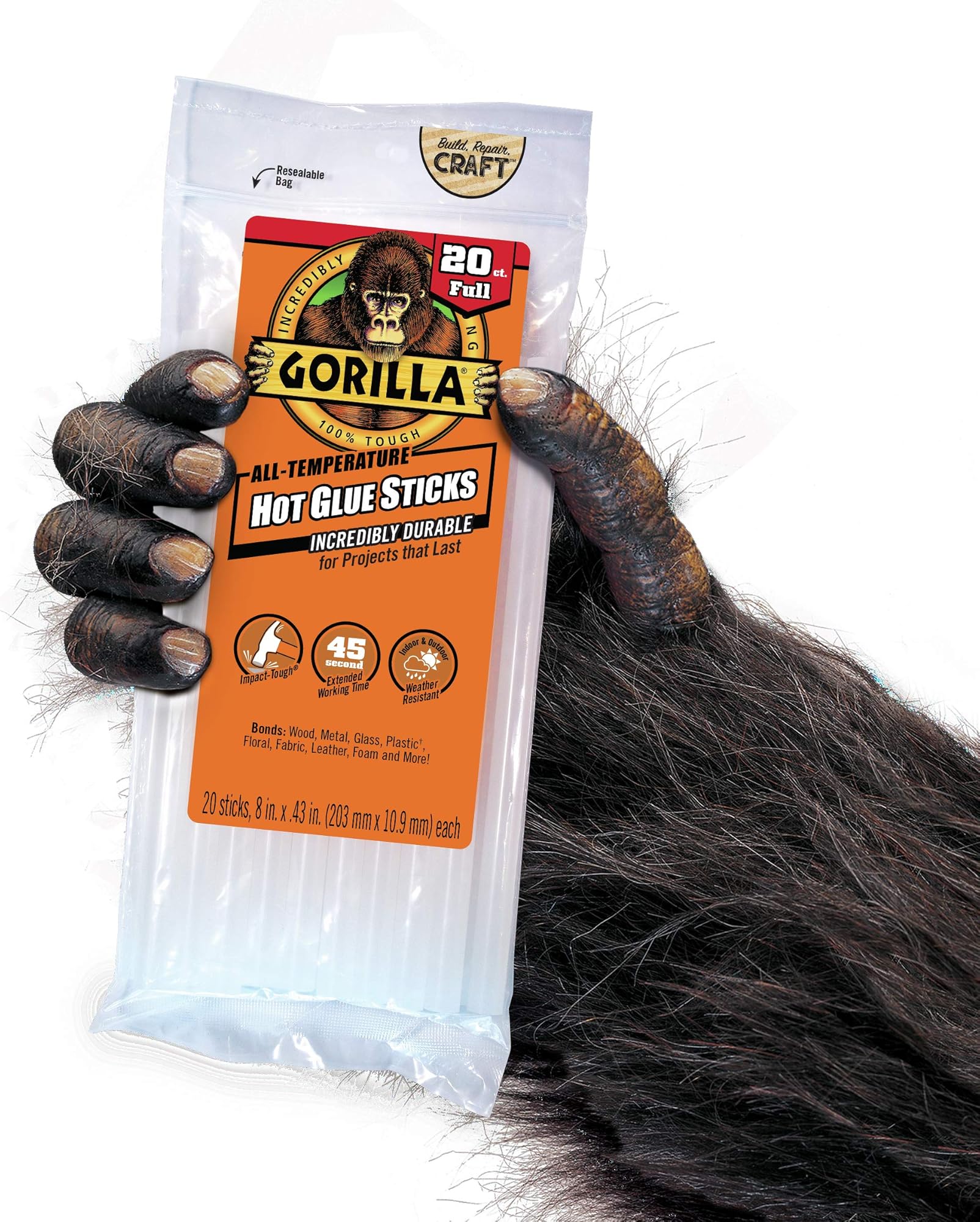 מקלות דבק חמים של גורילה, דבק שקוף, גודל מלא 20 ס"מ אורך x 0.43 ס"מ קוטר, 20 יחידות (חבילה של 1) - בטוח לכל הטמפרטורות עם זמן עבודה מורחב