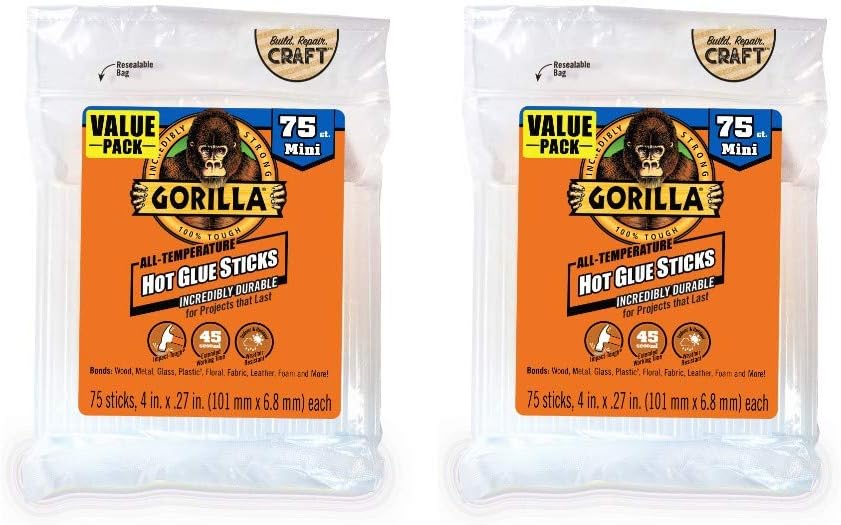 מקלות דבק חמים של גורילה, דבק שקוף, גודל מיני 10 ס"מ אורך x 0.5 ס"מ קוטר, 75 יחידות (חבילה של 2) - בטוח לכל הטמפרטורות עם זמן עבודה מורחב