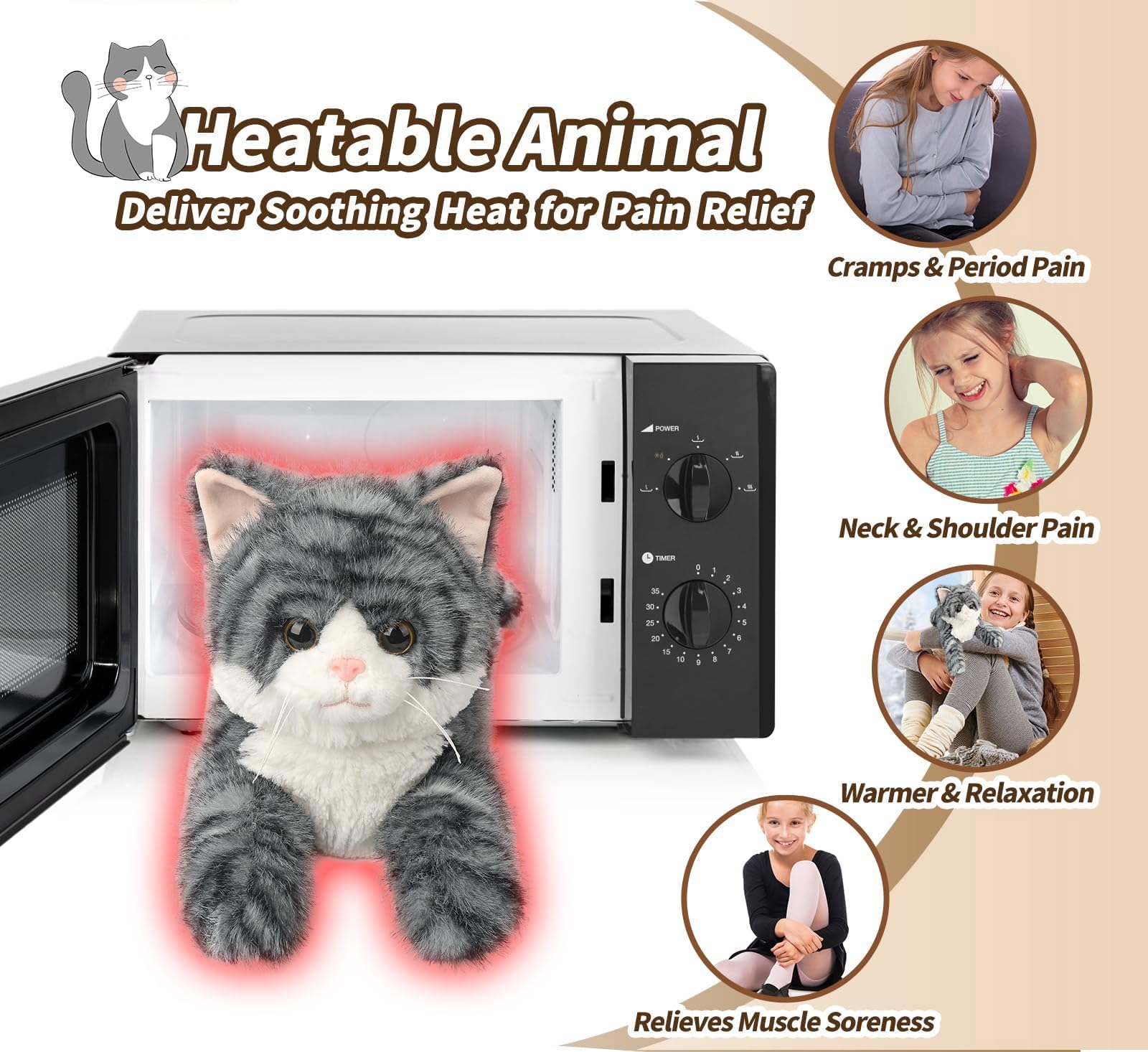 חיות פרווה של חתול טאבי אפור, בובת פרווה מקסימה הניתנת לחימום במיקרוגל לחום ונוחות, צעצועי חתולים בניחוח לבנדר הניתנים לחימום וקירור, מתנות קטיפה רכות וחמודות לילדים ומבוגרים