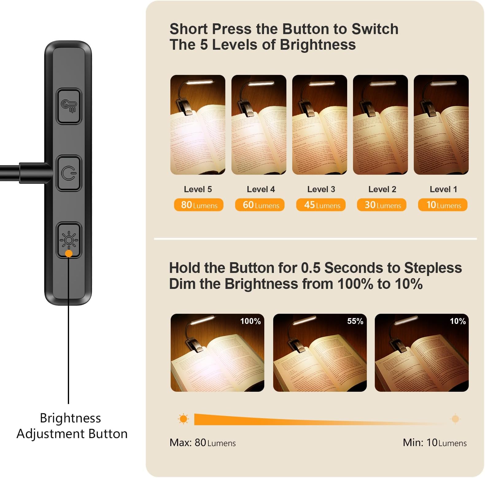 - נטענת ועמידה לאורך זמן: סוללה מובנית בקיבולת גבוהה של 1200 מיליאמפר/שעה, מנורת הקריאה יכולה לספק לכם 8-80 שעות של תאורה לאורך זמן. טעינה מלאה אורכת רק שעתיים, ו-4 נוריות LED יכולות להראות את רמת הכוח בזמן אמת.