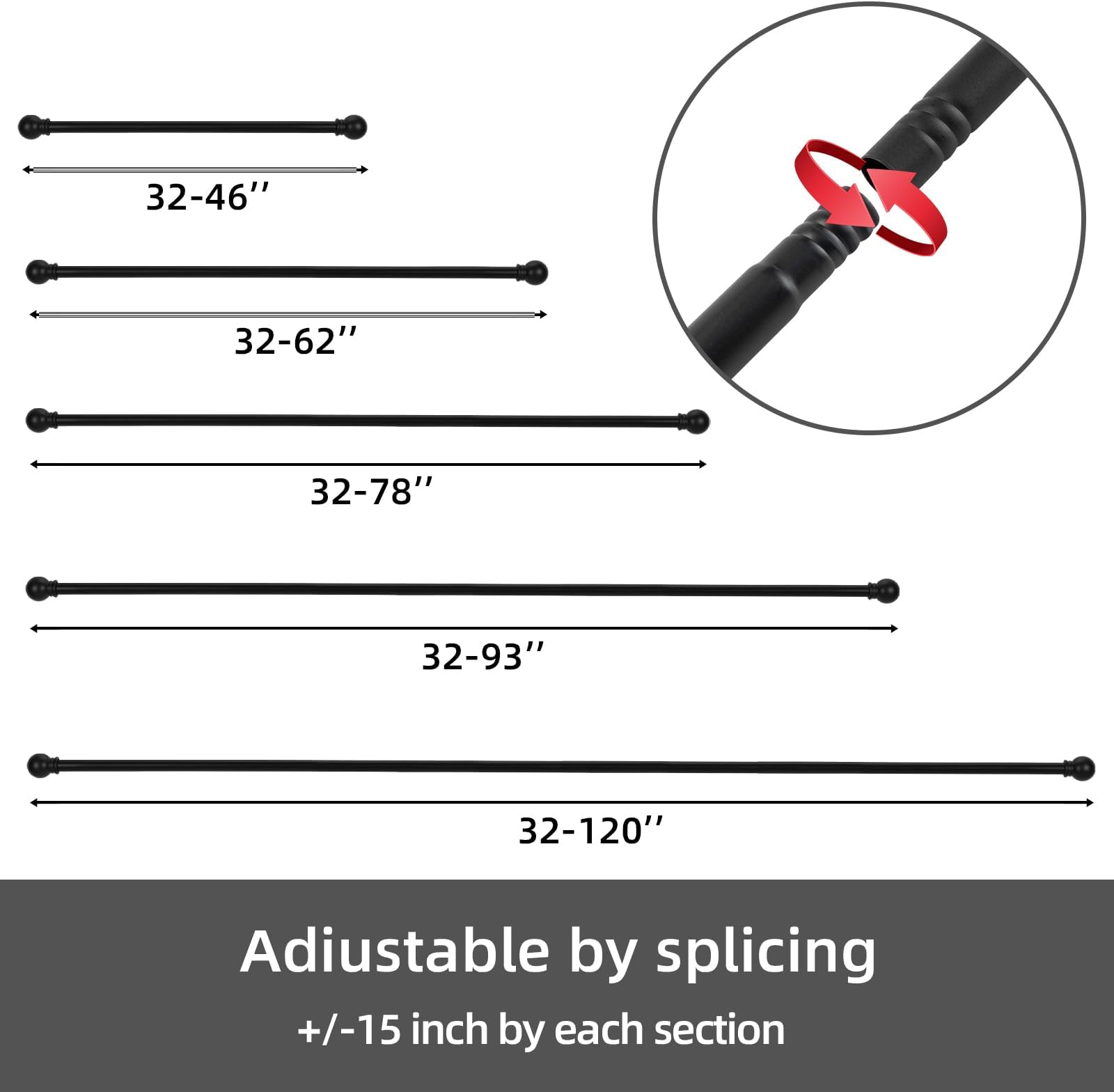 - שימו לב: יש להתאים את אורך מוט הווילון על ידי הגדלת מספר המוטות. לא טלסקופי. האורכיים הזמינים עבור פריט זה הם 32 אינץ' ו-46 אינץ'.