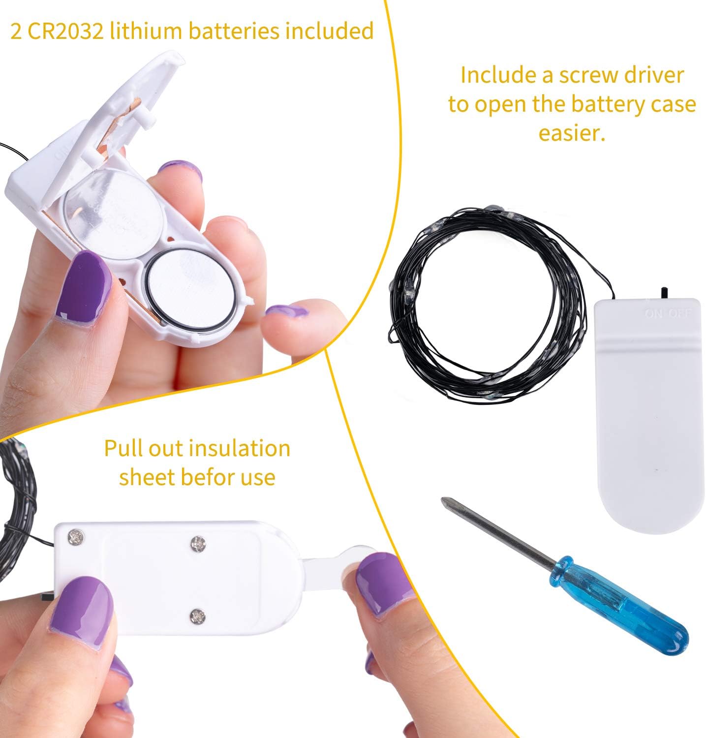 - 【 חיי סוללה ארוכי טווח 】- אורות הפיות המיניאטוריים הללו, עשויים מחוטי כסף חזקים ואיכותיים ונורות LED חסכוניות באנרגיה המחזיקות מעמד עד שנתיים, קלים לשימוש ובטוחים למגע הודות למתח הנמוך שלהם. סוללות השעון CR2032 הכלולות מאפשרות לאורות להישאר דולקים יותר מ-72 שעות וניתן להפעיל או לכבות אותם במהירות באמצעות כפתור פשוט.