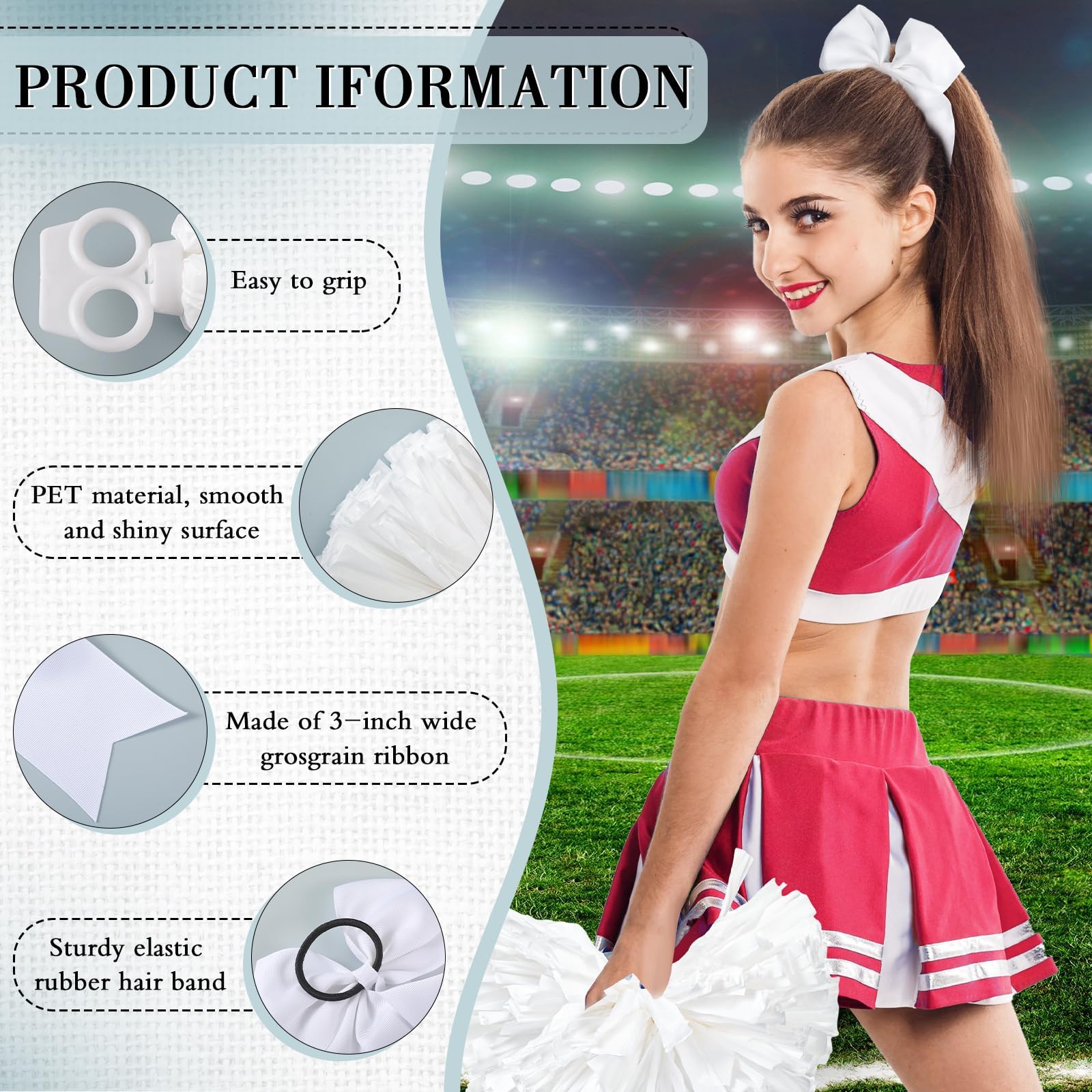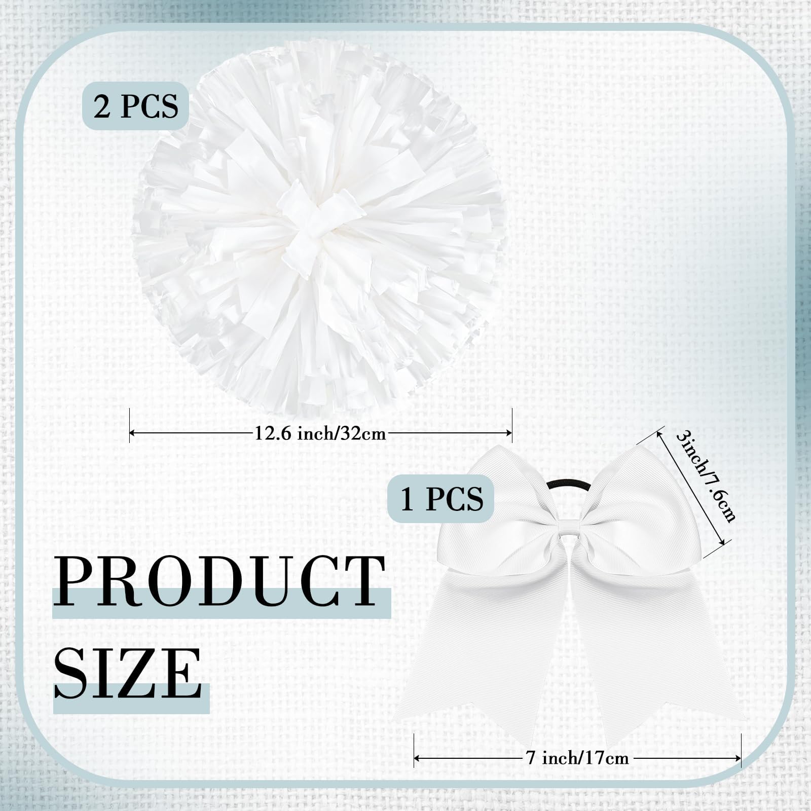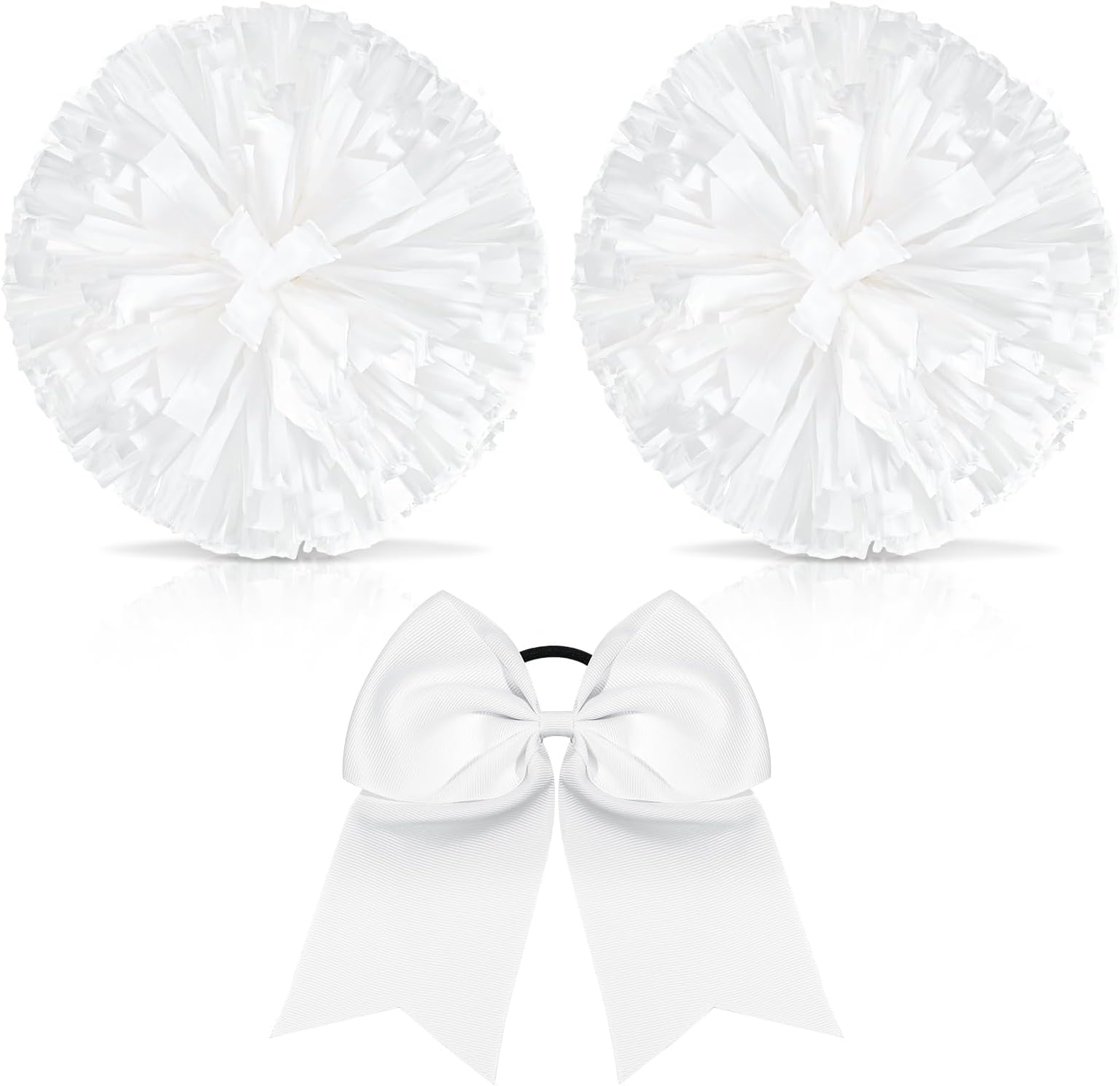 3 יחידות פונפונים למעודדות Hanaive וקשת גדולה לשיער למעודדות, ציוד עידוד מתכתי לעידוד ספורט וריקודים (פונפונים לבנים, מט)