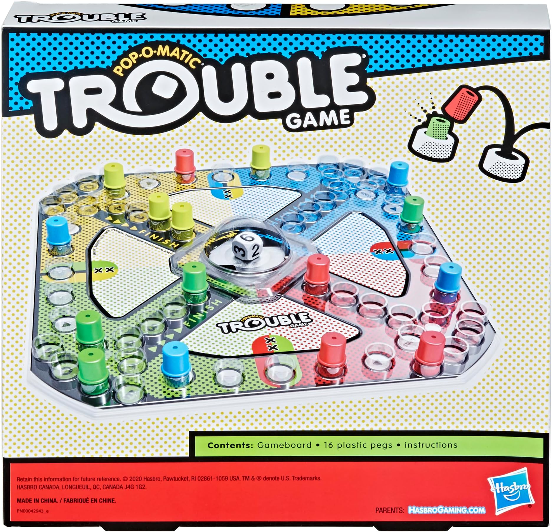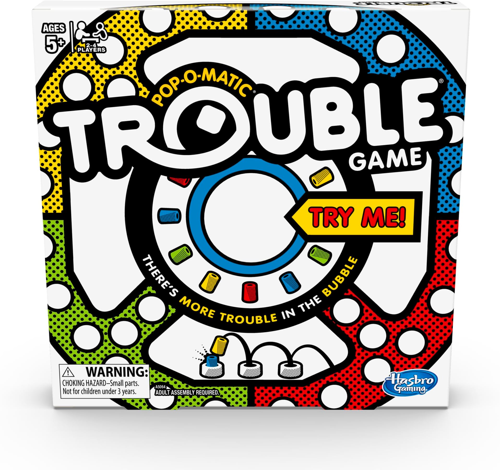 משחק Trouble הוא כיף של מרוצים, מרדף ופיצוץ יתדות! ההתרגשות מתחילה ברגע ששחקן לוחץ על בועת ה-Pop-O-Matic כדי לגלגל את הקובייה. לאחר מכן השחקנים מתחרים כדי להכניס את כל 4 כלי המשחק שלהם מסביב ללוח. אבל היזהרו! היתד של שחקן עלול להיפגע ולהישלח חזרה לנקודת ההתחלה, אם שחקן אחר נוחת על אותו משבצת. היו הראשונים להביא את כל 4 היתדות לאזור הסיום כדי לנצח. עם מהדורה זו, ילדים יכולים ליהנות ממשחק Trouble קלאסי או מגרסה מאתגרת יותר עם משבצות Power Up. משחק קלאסי זה הוא אחד ממשחקי המשפחה הטובים ביותר לערב משחקים ואחד ממשחקי הבית המרתקים ביותר לילדים. משחקי לוח לילדים כמו Trouble הם מתנות נהדרות לילדים בני 5 ומעלה. Trouble, Pop-O-Matic, ו-Hasbro Gaming וכל המאפיינים הקשורים הם סימנים מסחריים של Hasbro.