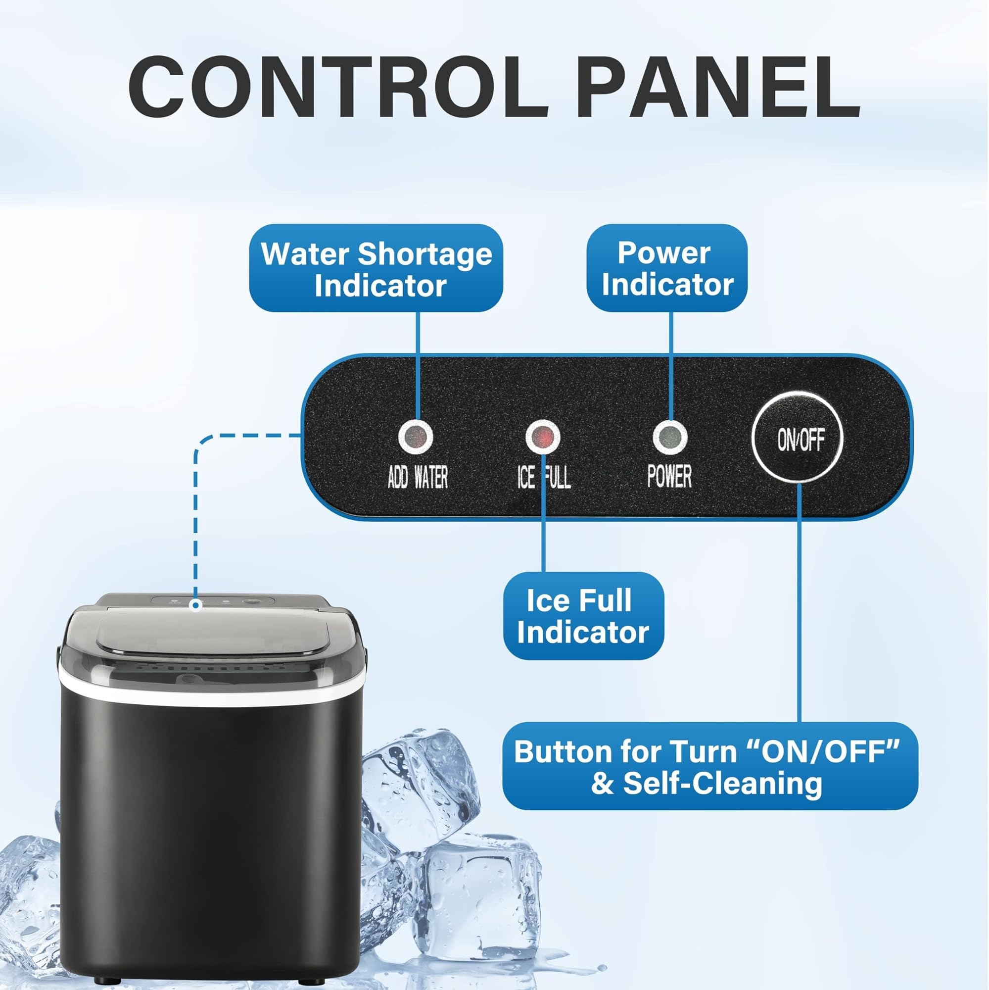 - קל לשימוש: פשוט מלאו את מכונת הקרח במים (פחות מ-1.2 ליטר), לחצו על כפתור ההפעלה. עם חיישן אינפרא אדום, כאשר סל הקרח מלא (מעל 1.3 פאונד), או כאשר המים אינם מספיקים, נורית החיווי תידלק ותעצור את ייצור הקרח.