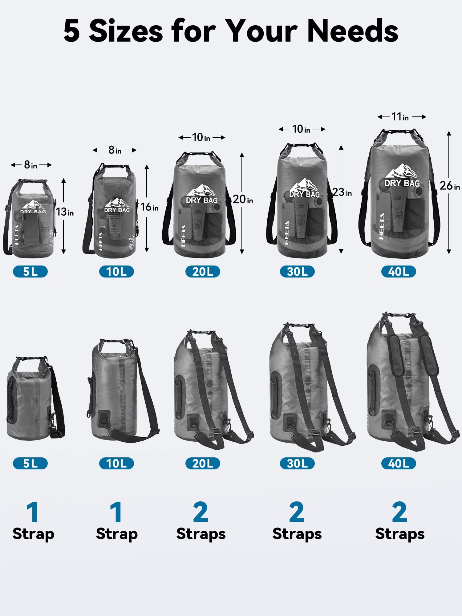 - 5 גדלים (5 ליטר/ 10 ליטר/ 20 ליטר/ 30 ליטר/ 40 ליטר) לבחירה - פריטים חיוניים לחופשת חוף וספינות תענוגות, מתנה מושלמת לגברים ולנשים כאחד. כל תיק כולל כיסוי טלפון עמיד למים תואם למסך מגע, המעניק הגנה מקיפה מפני מים לספורט ימי שלכם. גלגלו את הקצה העליון כדי להתאים את קיבולת התיק.