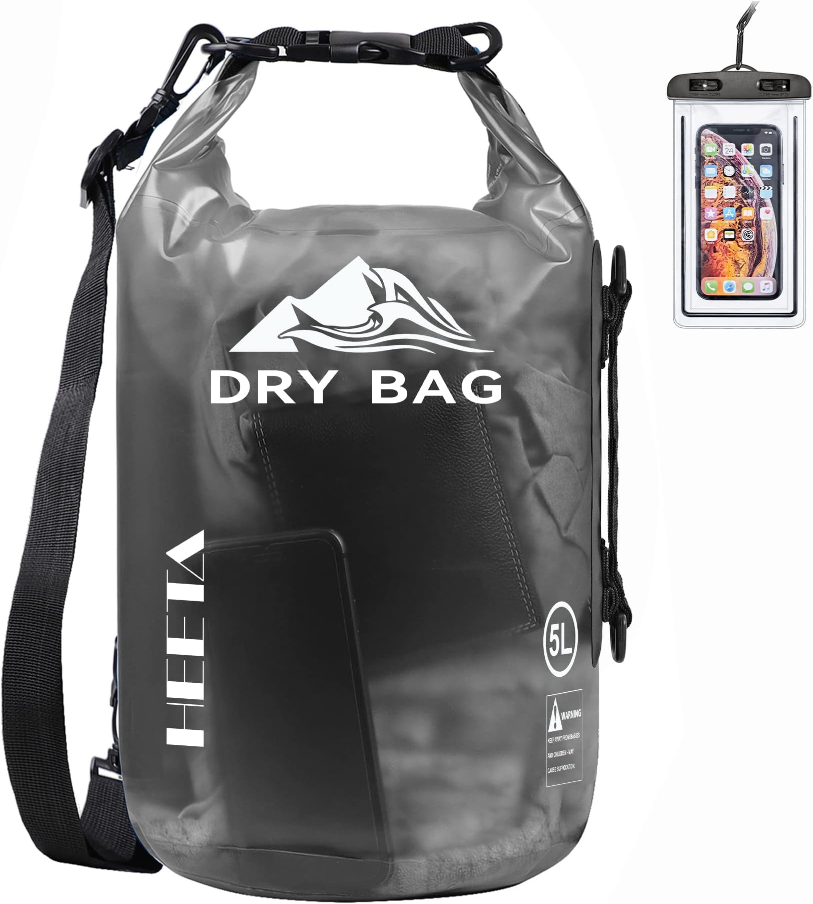 HEETA תיק יבש עמיד למים לנשים גברים, שקית אחסון קלת משקל עם רול-טופ יבשה עם נרתיק לטלפון לנסיעות שחייה שייט קיאקים גלשן קמפינג חוף אביזרים (שחור שקוף, 5 ליטר)