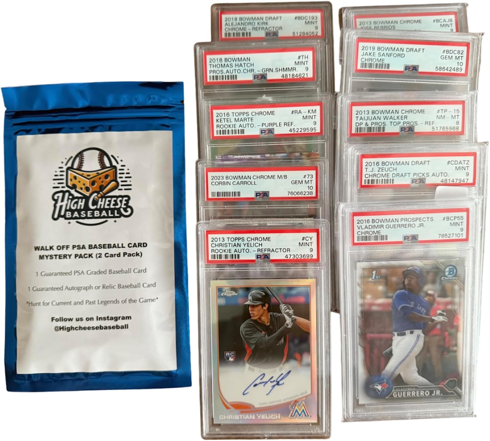 חבילת מסתורין של High Cheese Baseball Walk Off - 2 קלפים, 1 PSA מדורג ו-1 חתימה/שריד לא מדורג