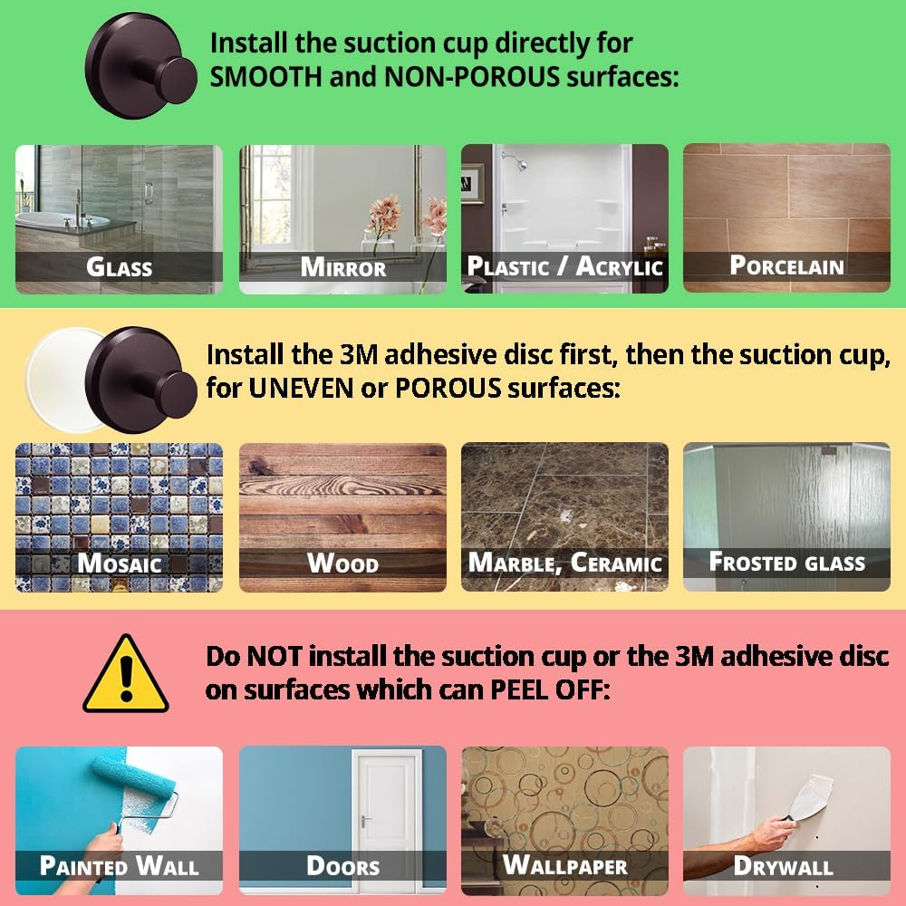 - זהירות ★ כוס היניקה פועלת רק על זכוכית, מראות, אריחי פורצלן מבריקים, מתקני מקלחת אקריליים/פלסטיק, נירוסטה חלקה, קוורץ, למינציה ומשטחים חלקים ולא נקבוביים אחרים. --- להתקנה על משטחים לא אחידים או נקבוביים, יש להתקין תחילה את דיסקיות הדבקה 3M המצורפות, ולאחר מכן את היניקה מעליהן. --- אין להתקין את דיסקיות היניקה או את דיסקיות הדבקה 3M על קירות צבועים, דלתות וטפטים.