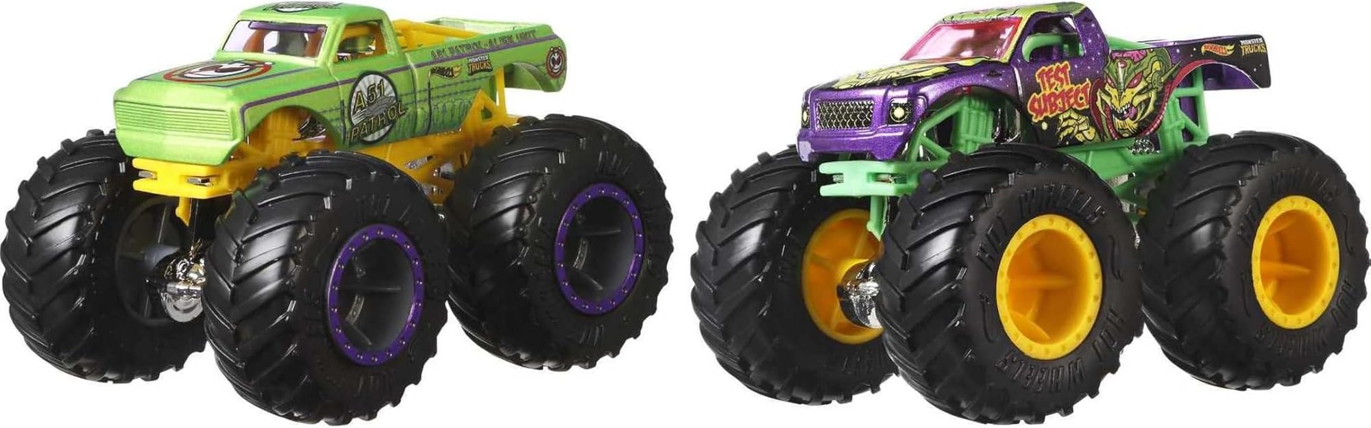 משאיות מפלצת Hot Wheels חבילה של 2, סט של 2 כלי רכב צעצוע להריסה בקנה מידה 1:64, לילדים ולאספנים (סגנונות עשויים להשתנות)