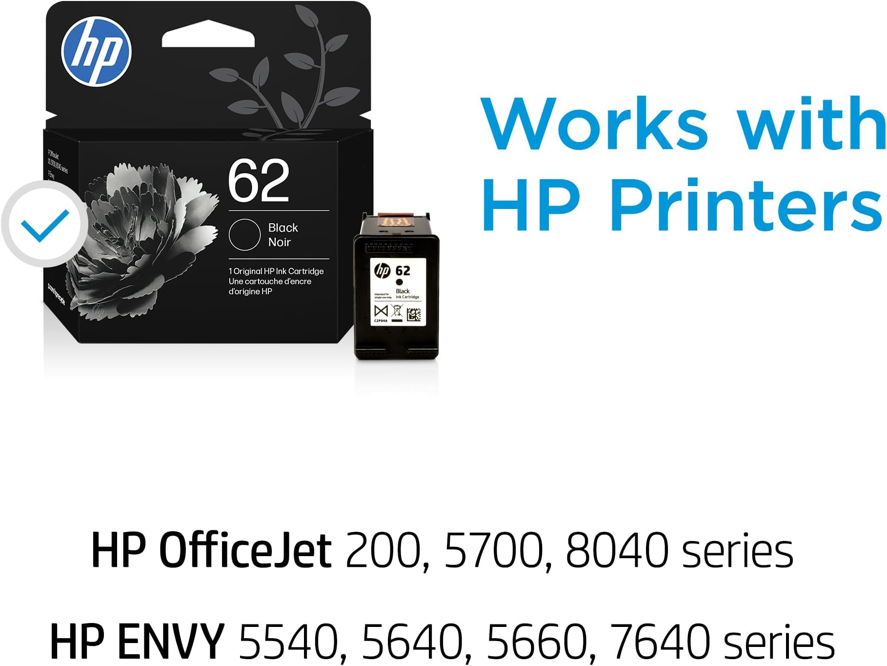 מחסנית דיו שחורה HP 62 | מתאים למדפסות Envy 5540, 5640, 5660, 7640, OfficeJet 5740, 8040, OfficeJet Mobile 200, 250 | מתאים ל-Instant Ink | C2P04AN | ייתכנו שינויים באריזה