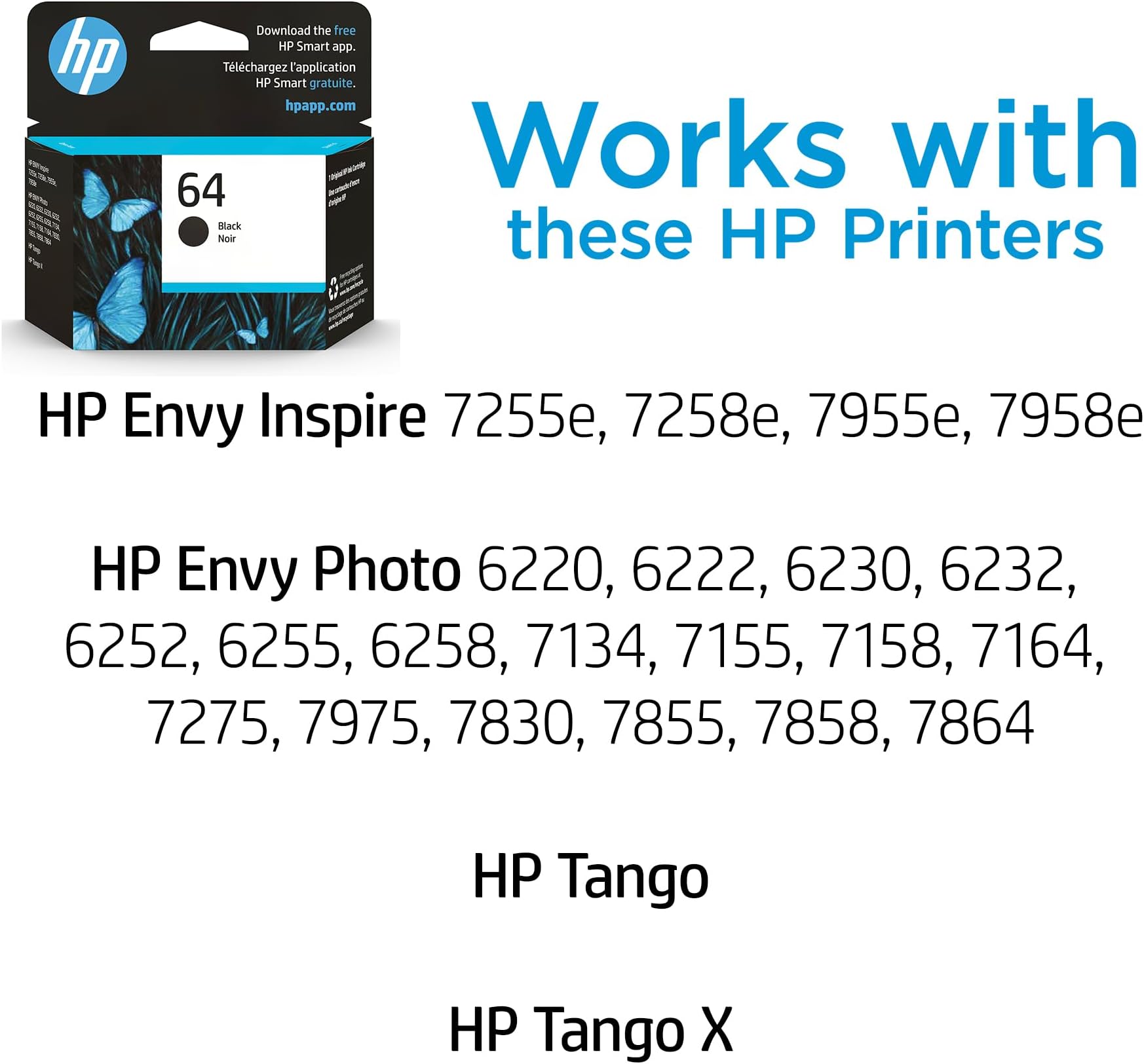 מדפסות HP 64 מחסניות דיו שחורות | מתאים לסדרות מדפסות: Envy Inspire 7950e; Envy Photo 6200, 7100, 7800; Tango | זכאי ל-Instant Ink | N9J90AN