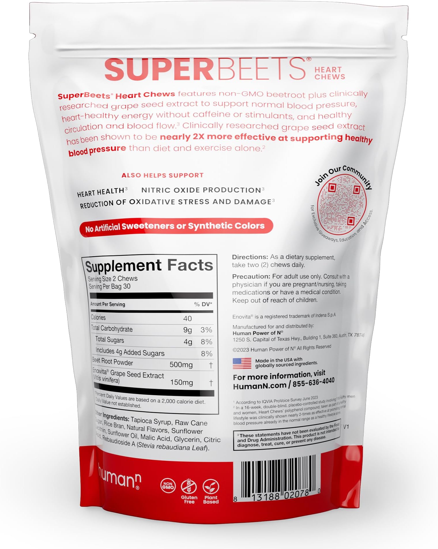 - על בסיס צמחי וללא הנדסה גנטית: סוכריות לעיסת הלב של SuperBeets, המיוצרות מרכיבים צמחיים וללא הנדסה גנטית, עשויות לסייע בתמיכה ברמות תחמוצת החנקן ובבריאות הלב וכלי הדם, הודות לפוליפנולים שנחקרו קלינית ותוספי סלק מאבקת שורש סלק.