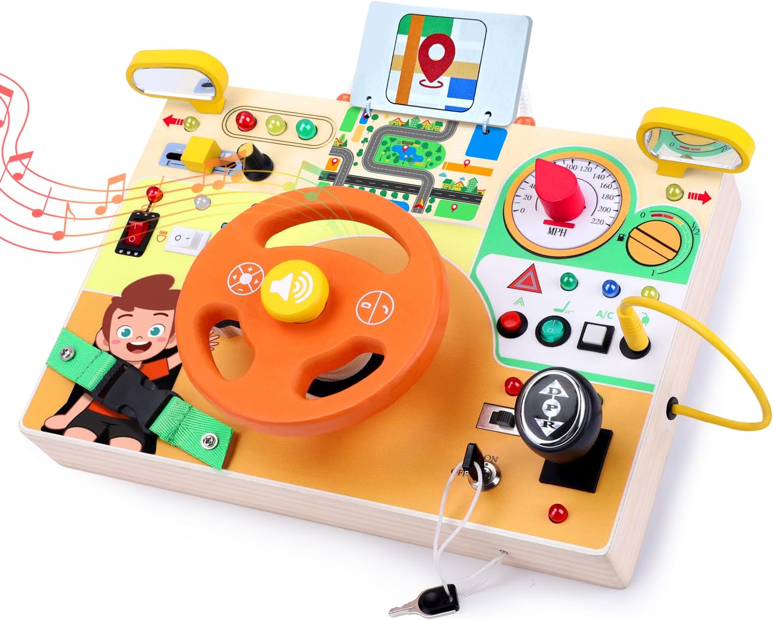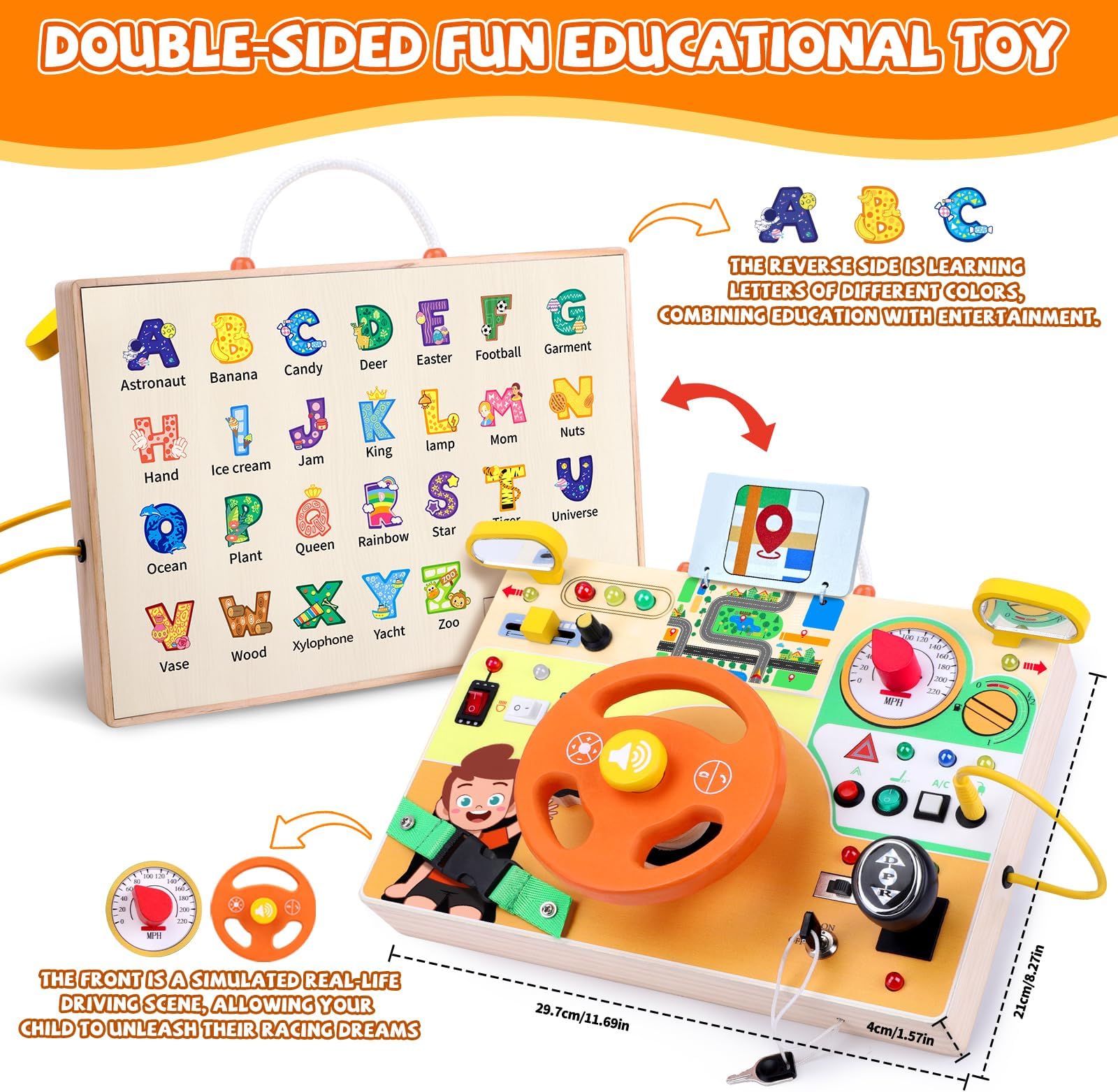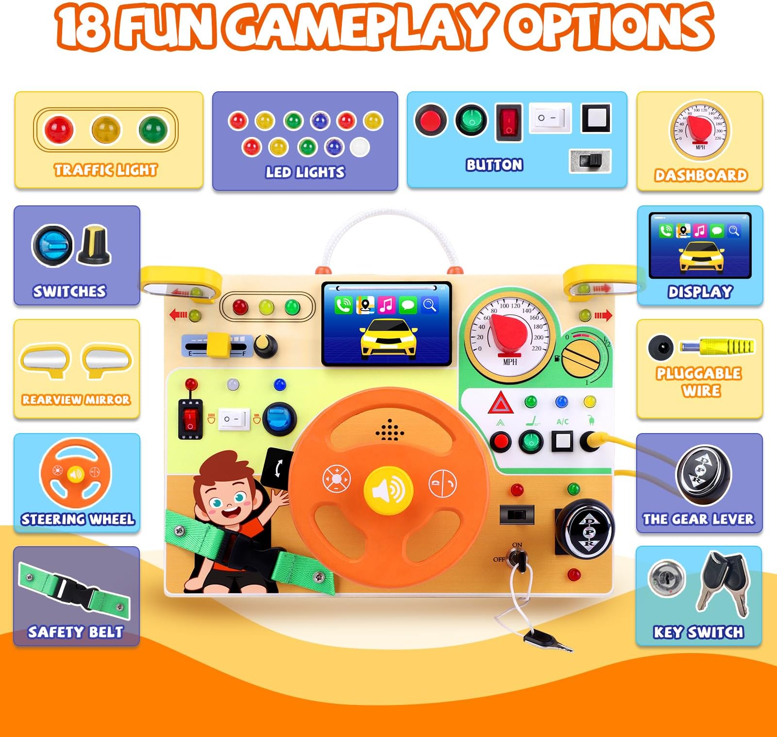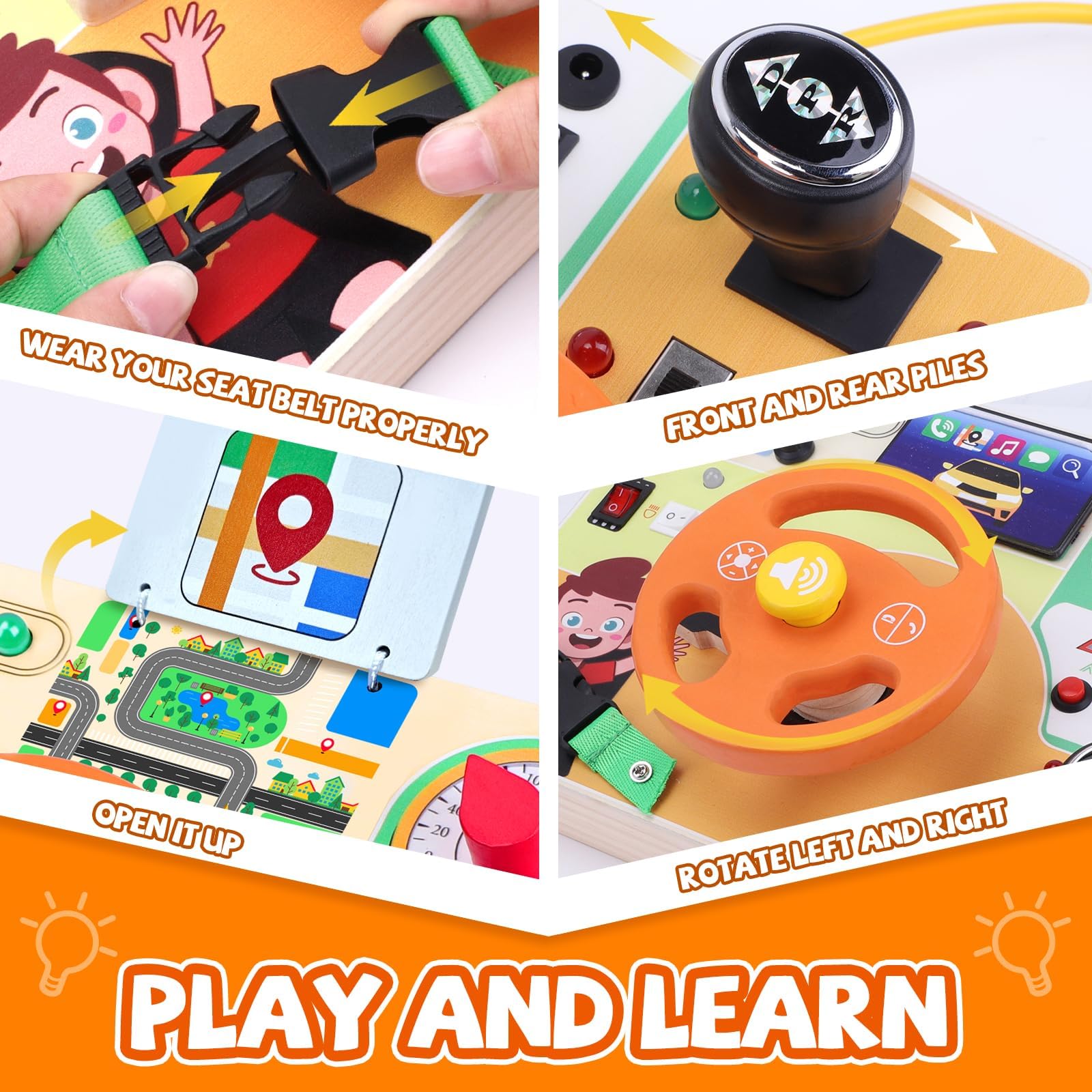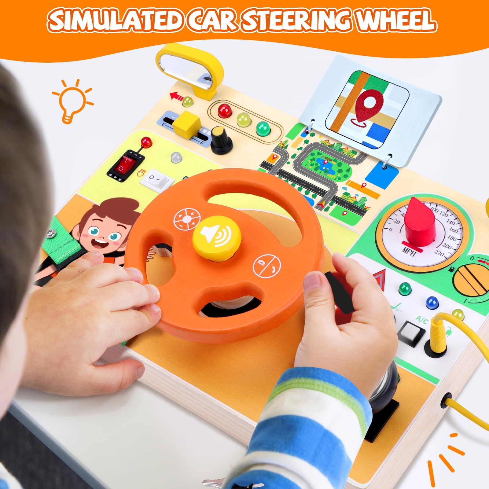 - חווית למידה מרתקת - צעצועי מונטסורי "Busy Board" שלנו מגיעים עמוסים בפעילויות סימולציית נהיגה מהנות כמו מתגי הצתה, הגה ותאורה מגוונת, המקדמים מוטוריקה עדינה וקואורדינציה עין-יד עבור הקטנטנים שלכם - כלי למידה מוקדמת מושלמים לפעוטות בגילאי 1-3!