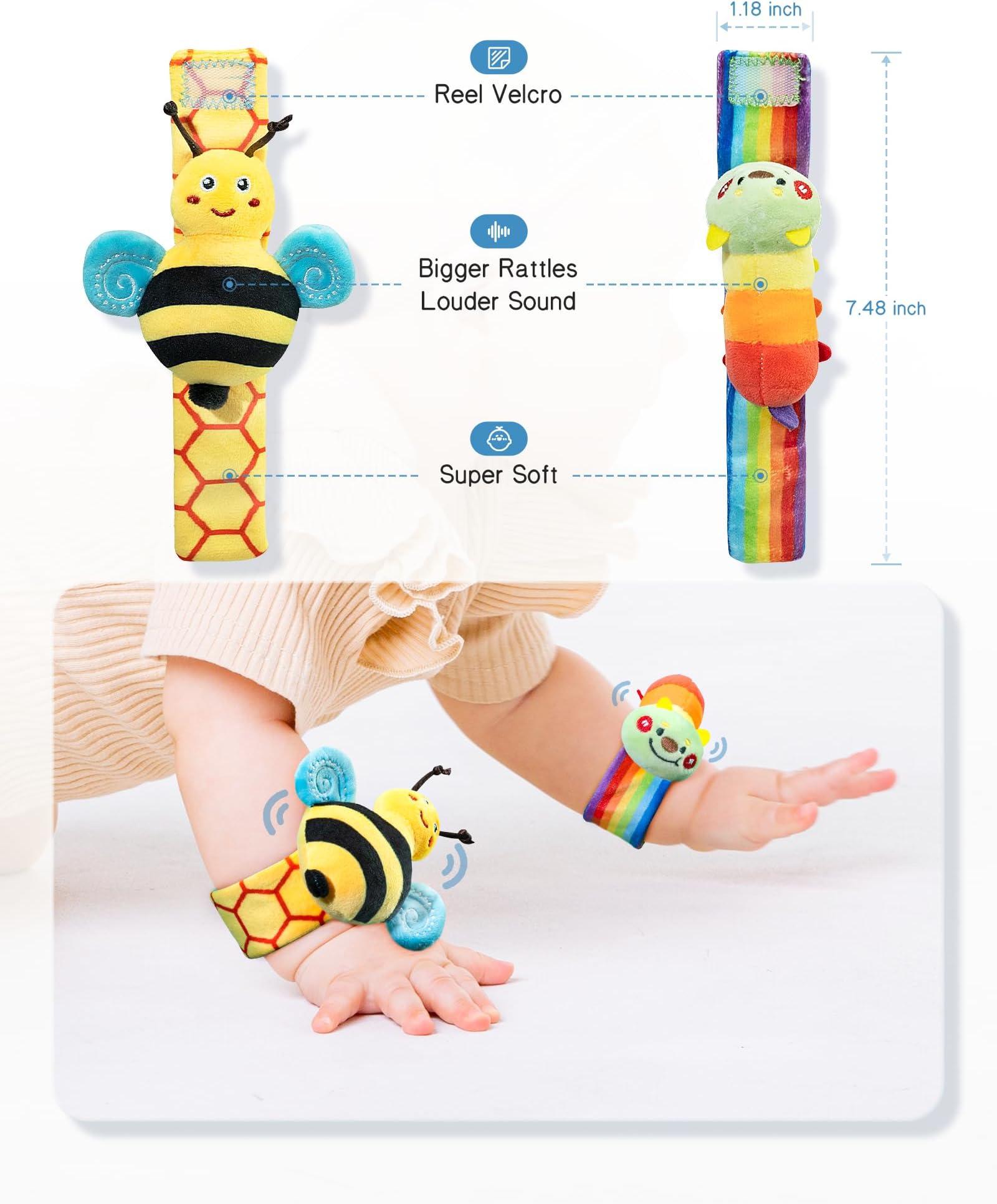 - התאמה נוחה - סט זה מכיל שני רעשנים רכים לפרק כף היד ושני מציאי רגליים. רעשנים צבעוניים ובהירים אלה מתאימים בקלות ובנוחות לפרקי הידיים והקרסוליים של התינוק. רצועות מורחבות מאפשרות שימוש מתמשך ככל שהתינוק גדל.