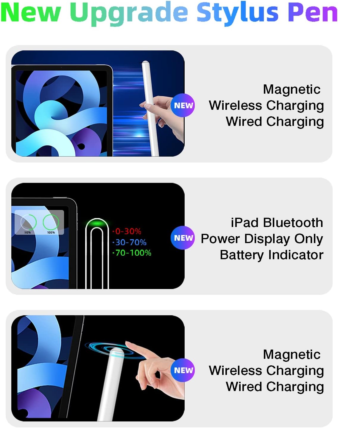 - 【טעינה מגנטית בלוטות'】עט הסטיילוס לאייפד תומך בחיבור בלוטות' ובעל עיצוב טעינה אלחוטית מגנטי. פשוט חברו את בלוטות' וחברו אותו באופן מגנטי לצד האייפד כדי לטעון. (אנא ודאו אם דגם האייפד שלכם תואם לפני הרכישה. דגמים שאינם תואמים לא יוכלו להיטען.) הוסיפו את הווידג'ט כדי לבדוק את הטעינה בזמן אמת. טען אותו בכל עת ובכל מקום. טעינה מלאה אורכת רק שעה וחצי ויכולה להחזיק מעמד עד 9 שעות פעולה תוך 20 דקות ותיכנסו למצב שינה.