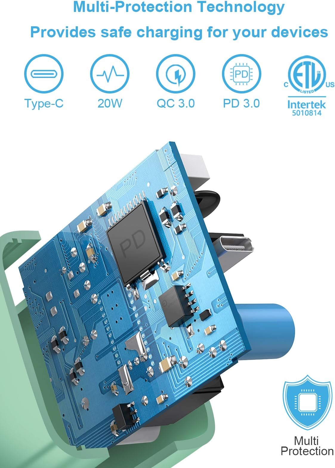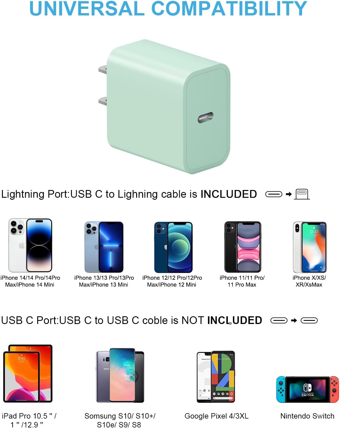 מטען מהיר לאייפון 14 13 12 מטען קיר USB C 20W PD עם כבל טעינה מהירה באורך 1.8 מטר לאייפון 14/14 פרו/14 פרו מקס/14 פלוס/13/12/11/פרו/פרו מקס/מיני/Xs מקס/X, אייפד - ירוק