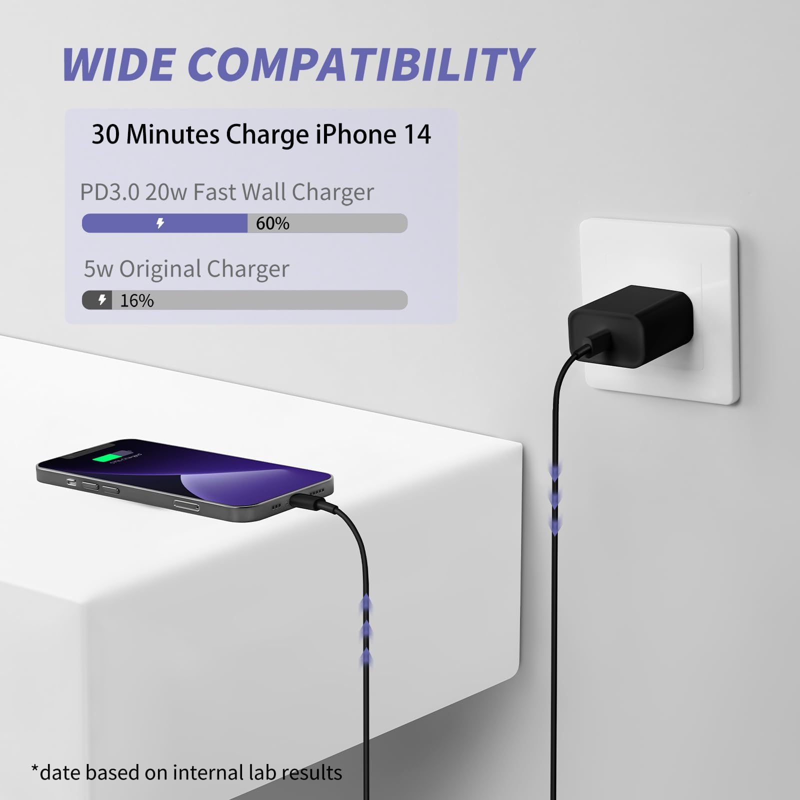 - מטען מהיר 3X לאייפון: מטען PD 3.0 20W USB-C עם כבל מסוג C ל-Lightning באורך 1.8 מטר, טוען את האייפון 11 12 13 14 עד 60% תוך 30 דקות בלבד, מה שחוסך לכם יותר משעה, בהשוואה למטען המקורי של 5W.